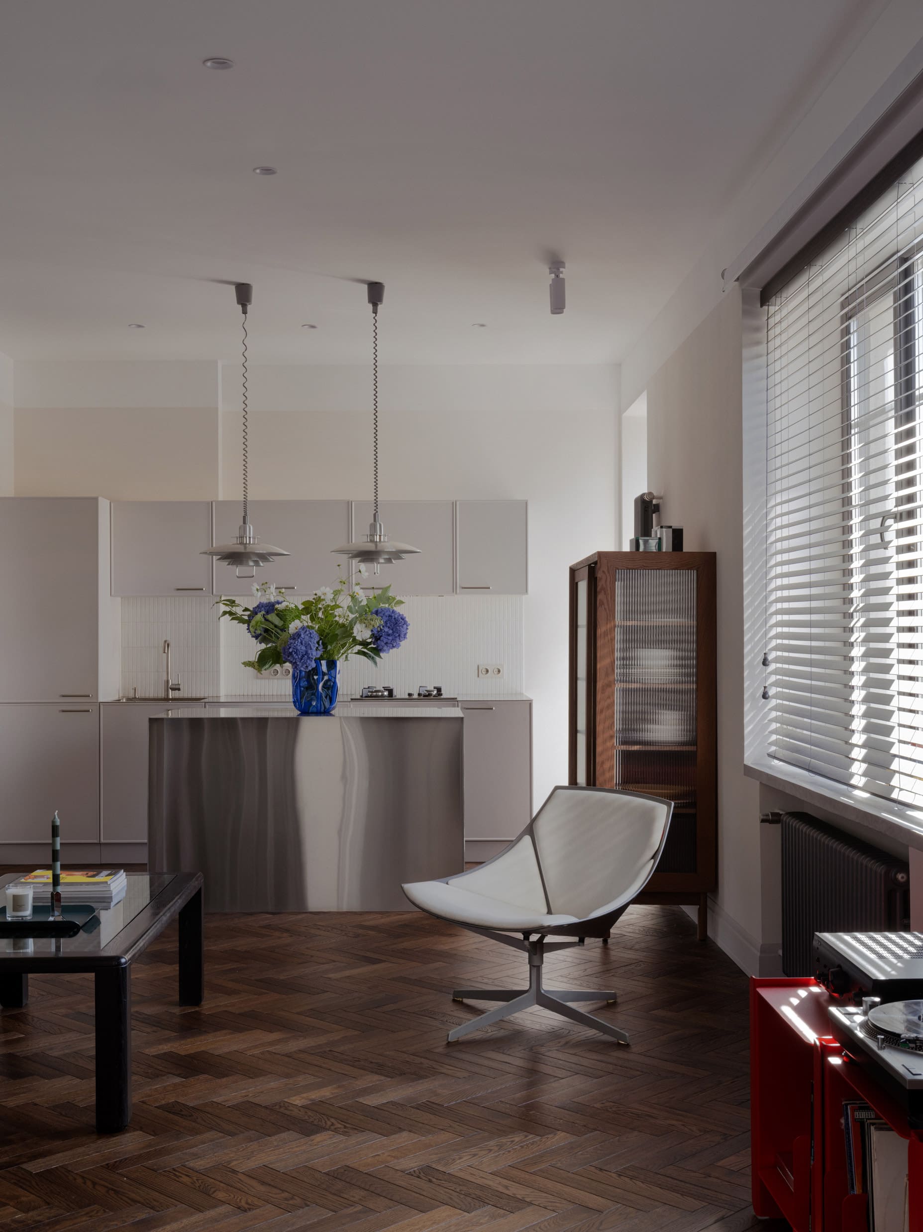 От старой советской кухни до современного острова из нержавеющей стали — Катя Ригер перепридумала интерьер квартиры в доме 1940-х годов. Длинный коридор с закругленной геометрией дизайнер сохранила: он, как и другие детали, связывает не только комнаты, но и разные временные эпохи.