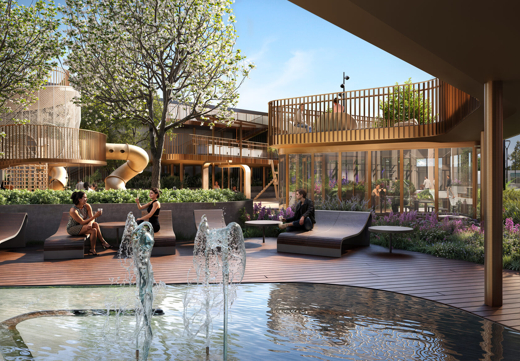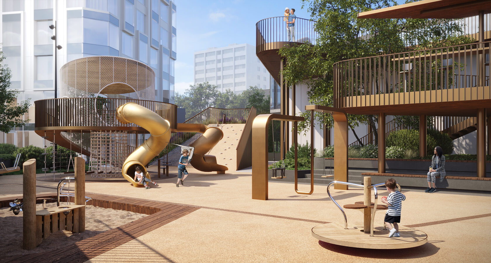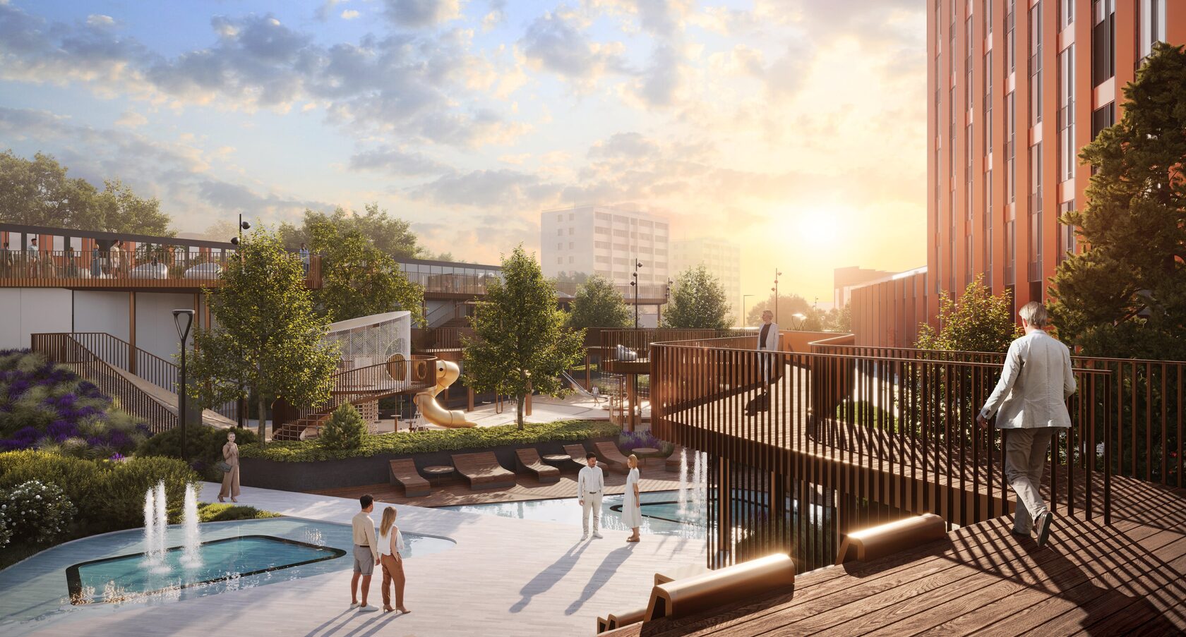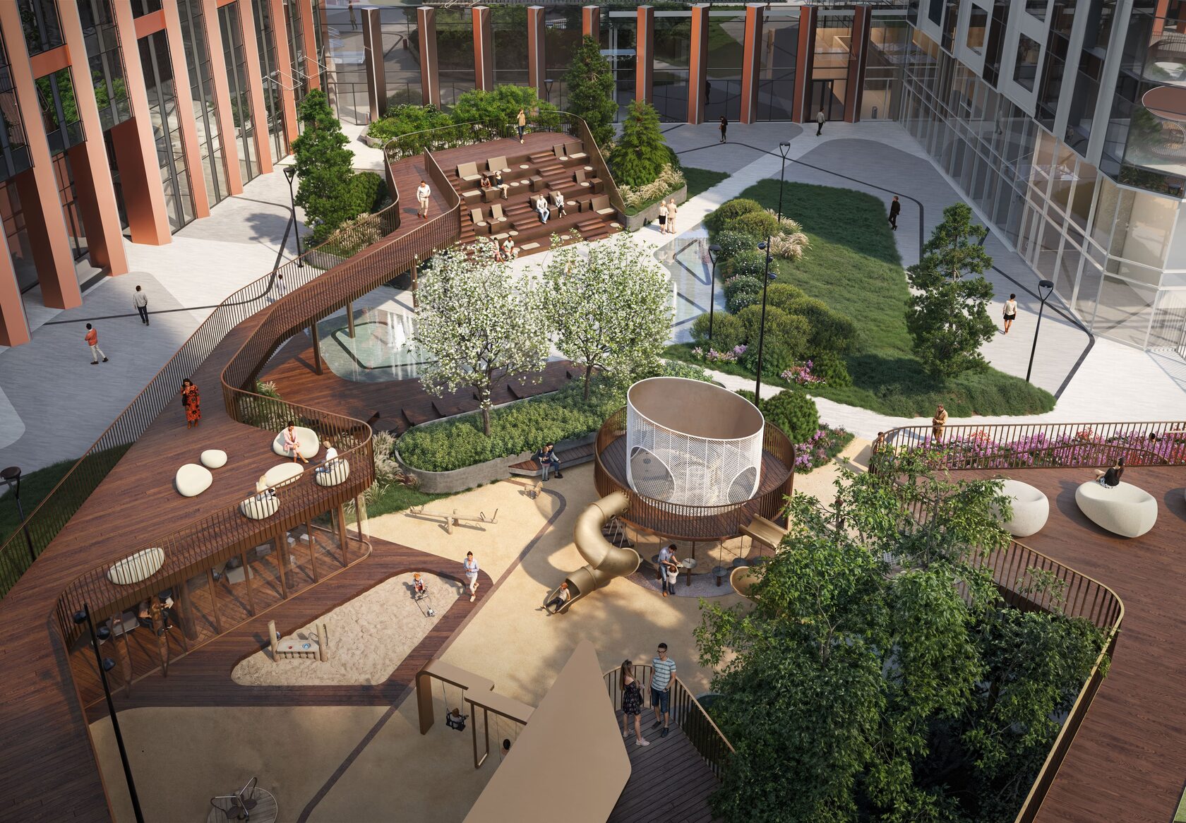 Его маршрут, извилистый, как река, ведет нас по всему парку, огибая игровые зоны и образуя уютные уголки для отдыха. Финальная точкой становится эксплуатируемая крыша на высоте почти пять метров — смотровая площадка, позволяющая с нового, неожиданного ракурса взглянуть на свой дом.