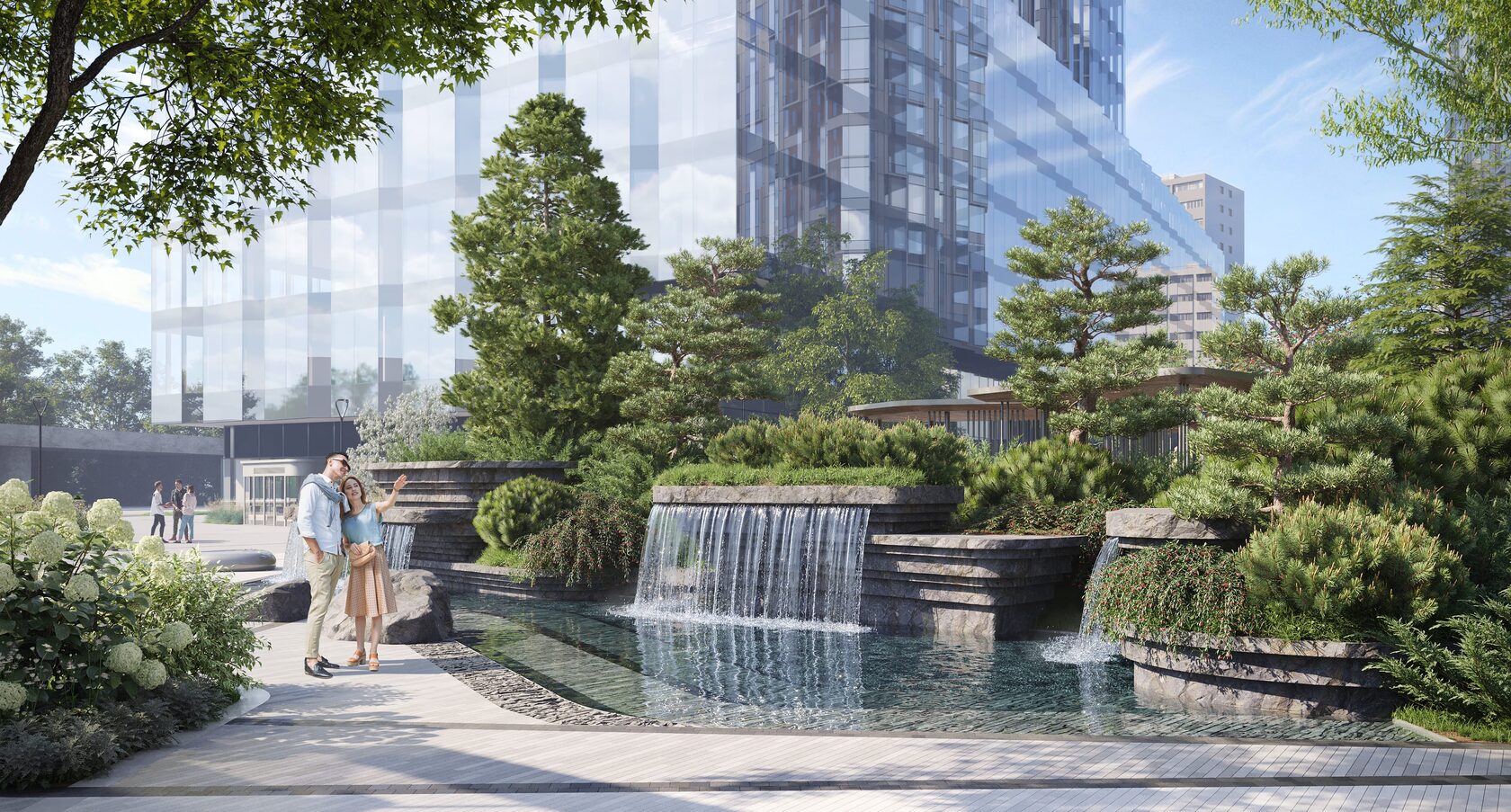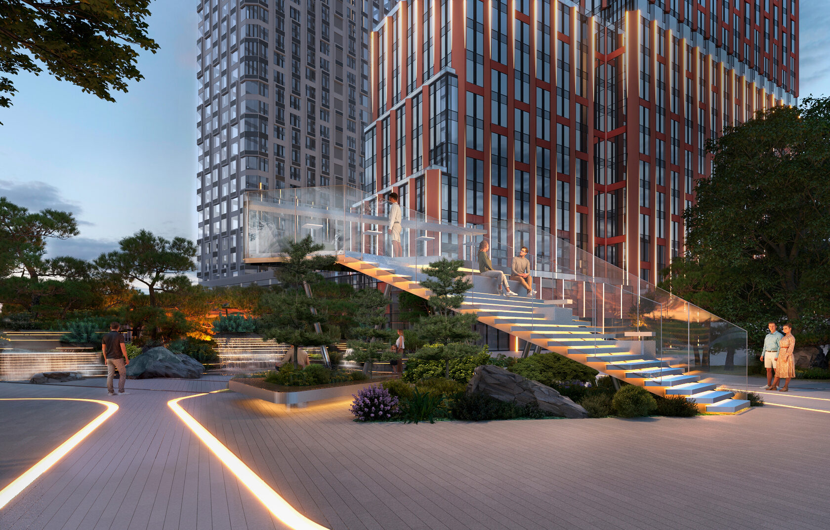 Девелопер не ограничился границами дворовой территории и разработал благоустройство прилегающего общественного пространства. Там появятся пешеходный бульвар и главная площадь с сильным природным образом, мотивы которого отсылают к горному ручью и речной долине.