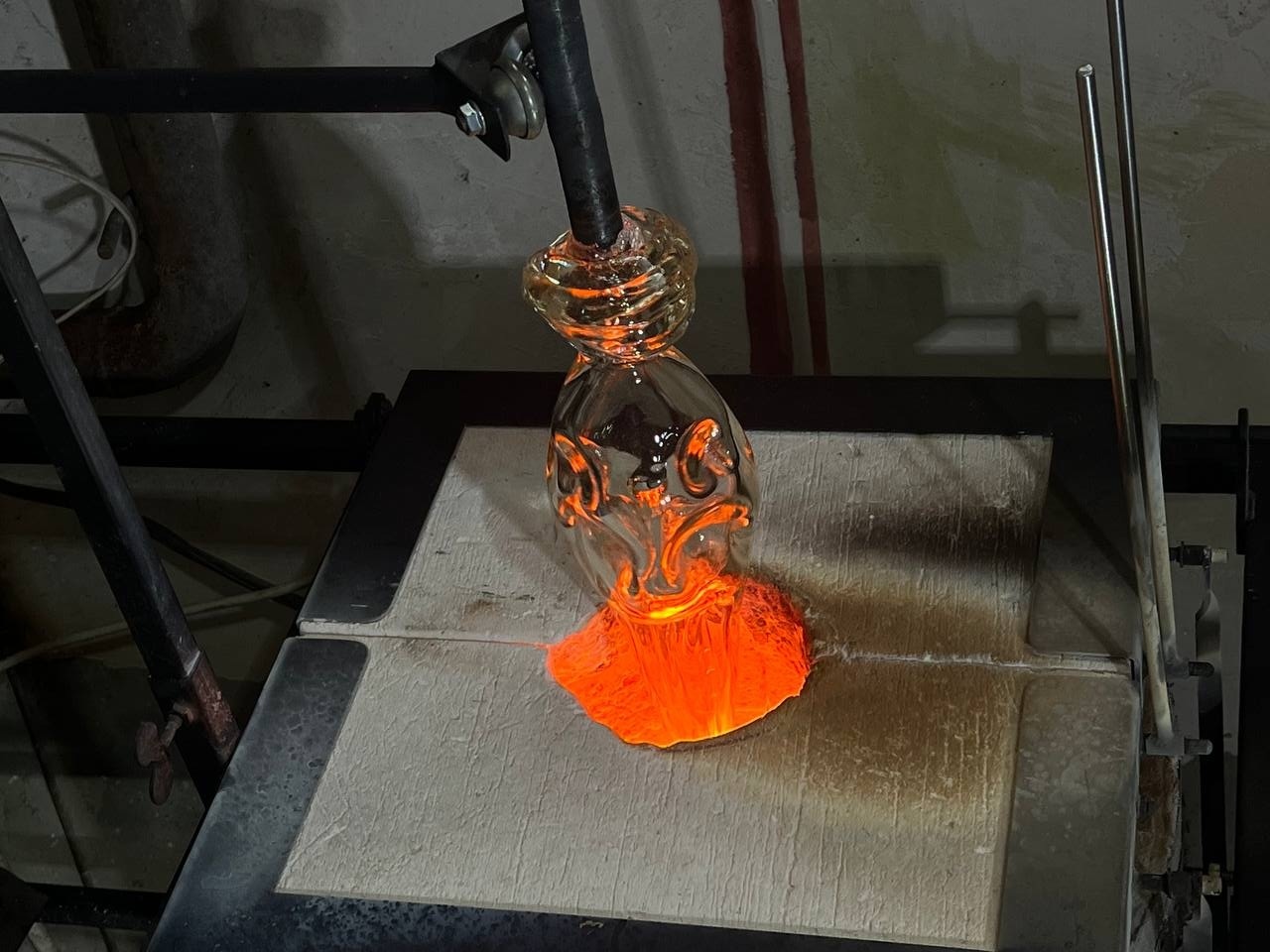 Весь процесс занял около 4,5 месяцев очень активной, постоянной работы. Над объектом трудилась целая команда, без которой воплотить его в жизнь было бы невозможно. Процесс выдувания костей занял примерно неделю. Потом заготовки отправились на отжиг (это процесс медленного остывания стекла в специальной печи, чтобы убрать внутри все лишнее напряжение). Финальный этап: холодная обработка и гравировка каждой детали при помощи алмазных инструментов. Сотрудники производства — Владимир Михеев и Анна Черникова — создали для скелета невероятно сложную металлокаркасную конструкцию.