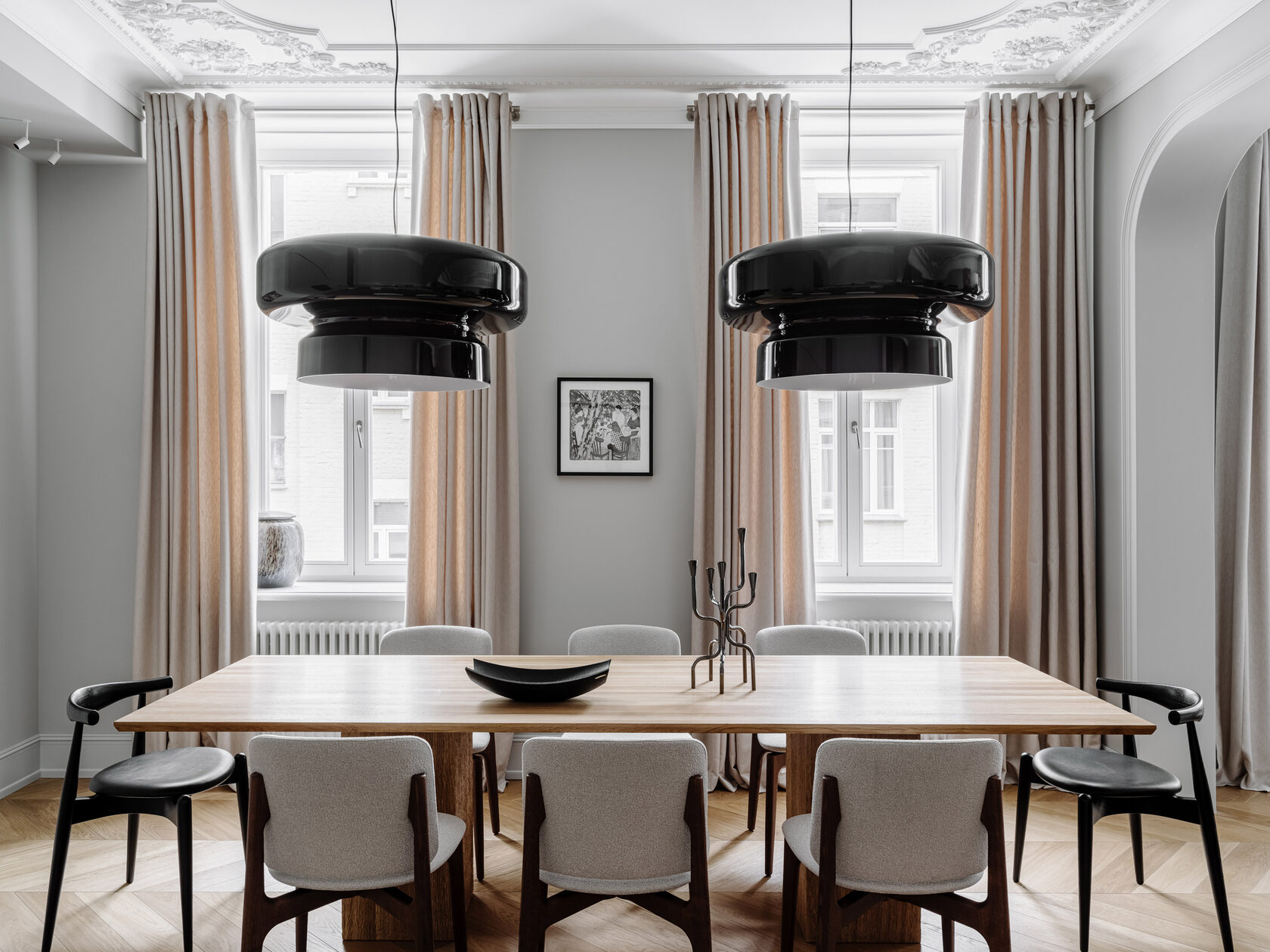Столовая зона. Обеденный стол выполнен на заказ по эскизам автора проекта; стулья, Very Wood; черные стулья, Carl Hansen & Søn; светильники над столом, Marset.