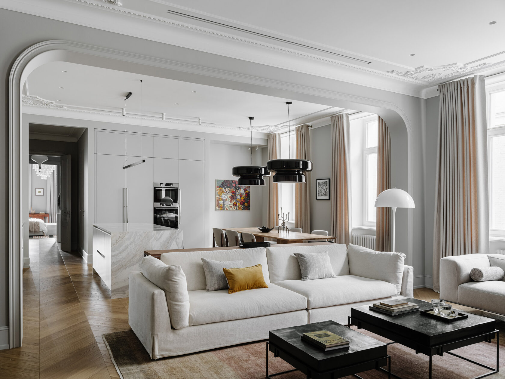 Квартира находится в реконструированном здании начала XX века, поэтому одной из задач было вернуть дух того времени. Так здесь появились пышная лепнина, распашные двери, паркет «елочкой» и даже изразцовая печь. Поскольку дом дореволюционный, повезло с планировкой — анфилада позволяет просматривать пространство от прихожей вплоть до зоны спальни.