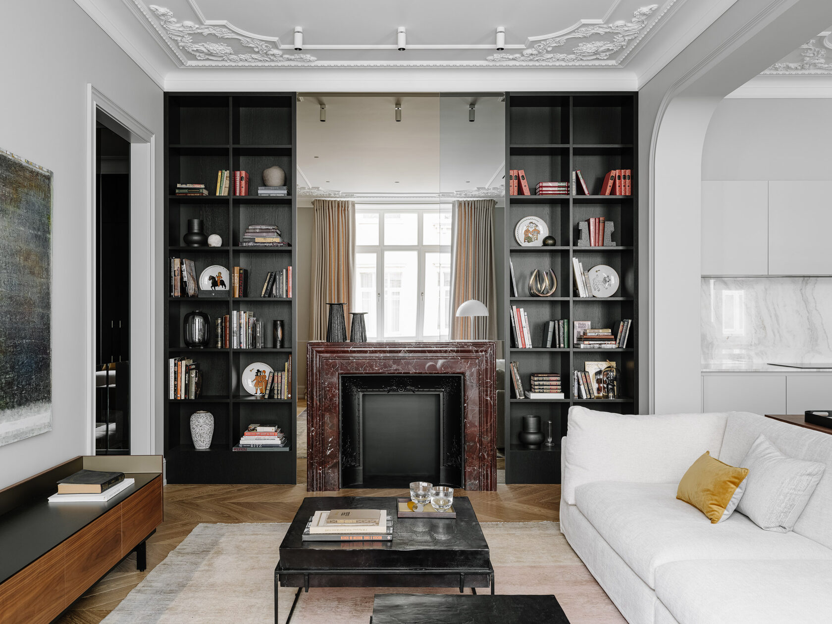 Фрагмент гостиной. Диван, Frigerio; комплект журнальных столиков, Loft Concept; тумба, Punt Mobles; зеркало за камином, мраморный портал, чугунная вставка камина и библиотека — все выполнено на заказ по эскизам автора проекта.