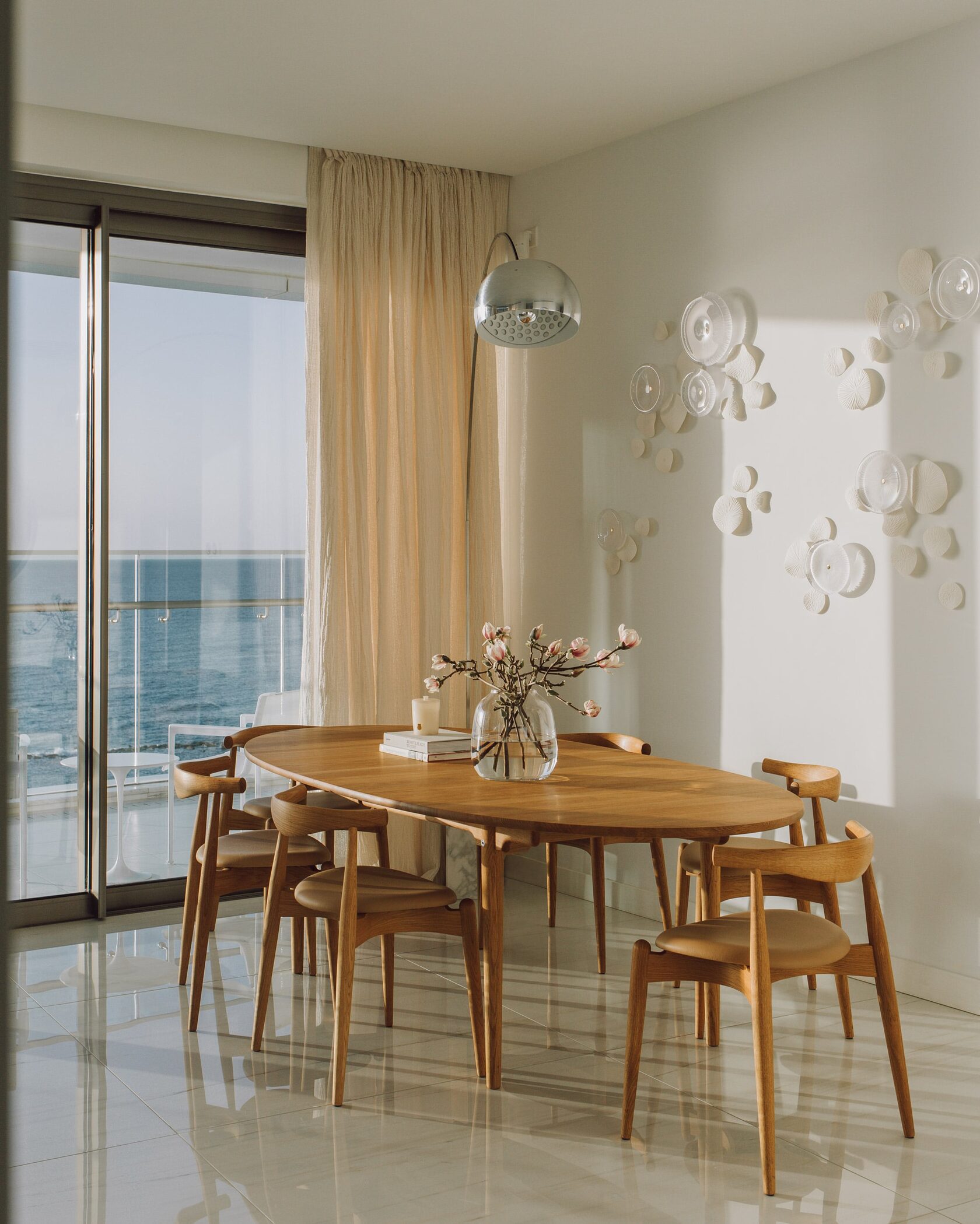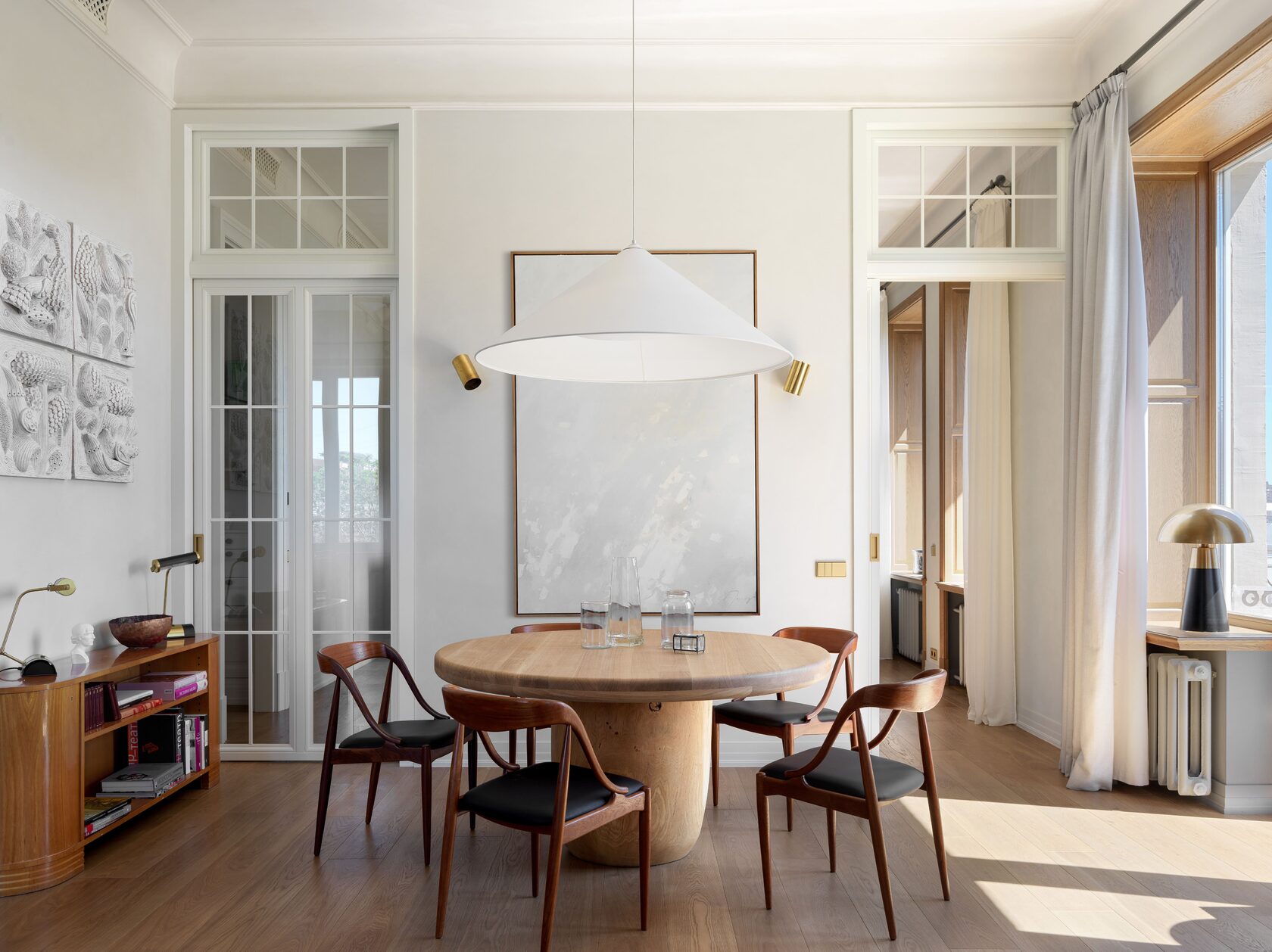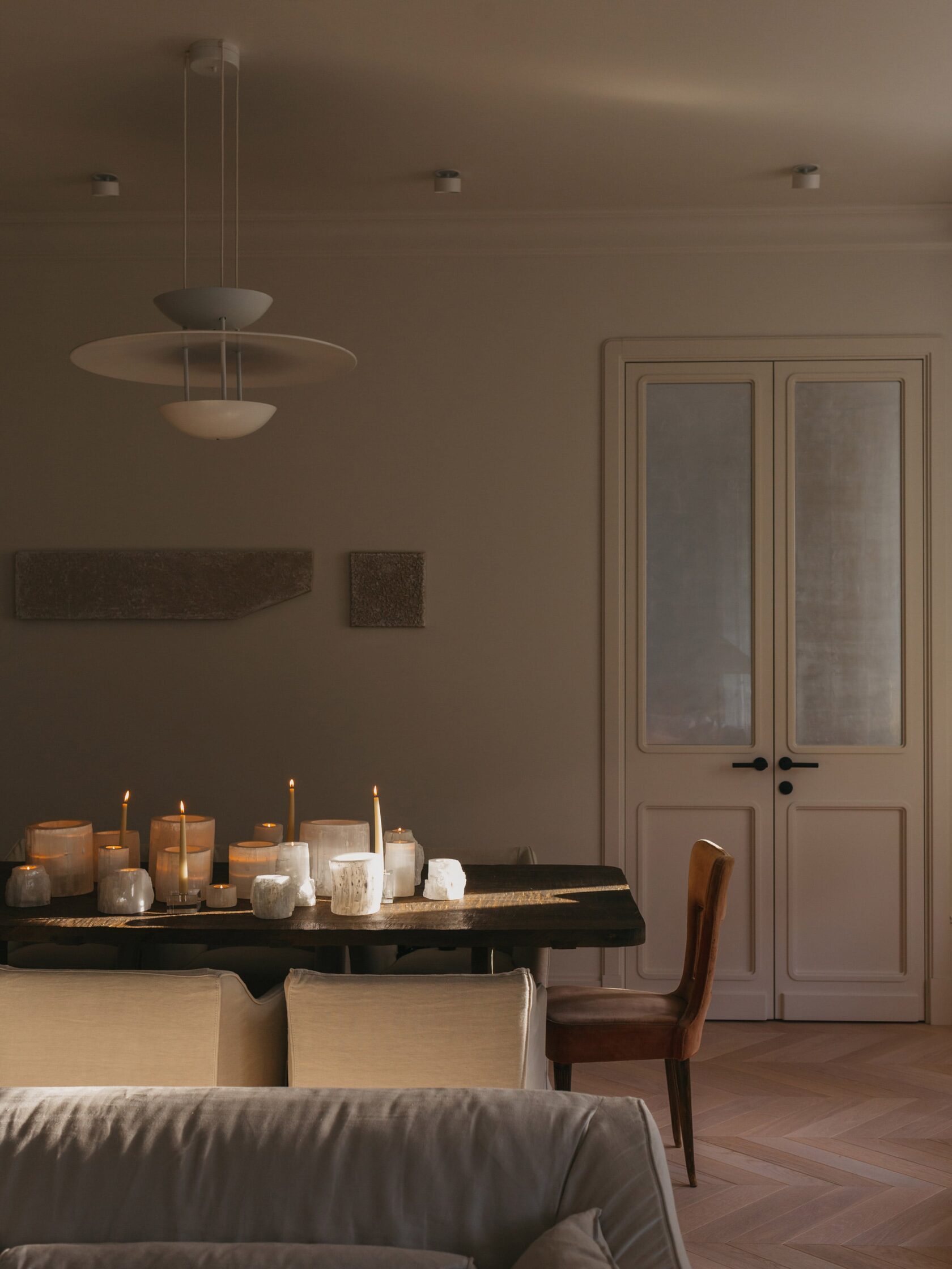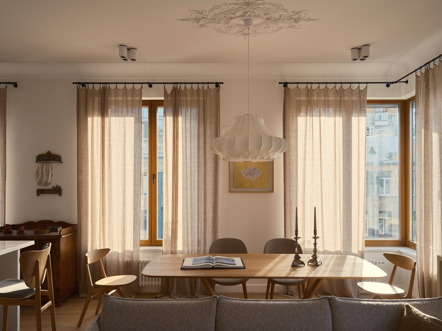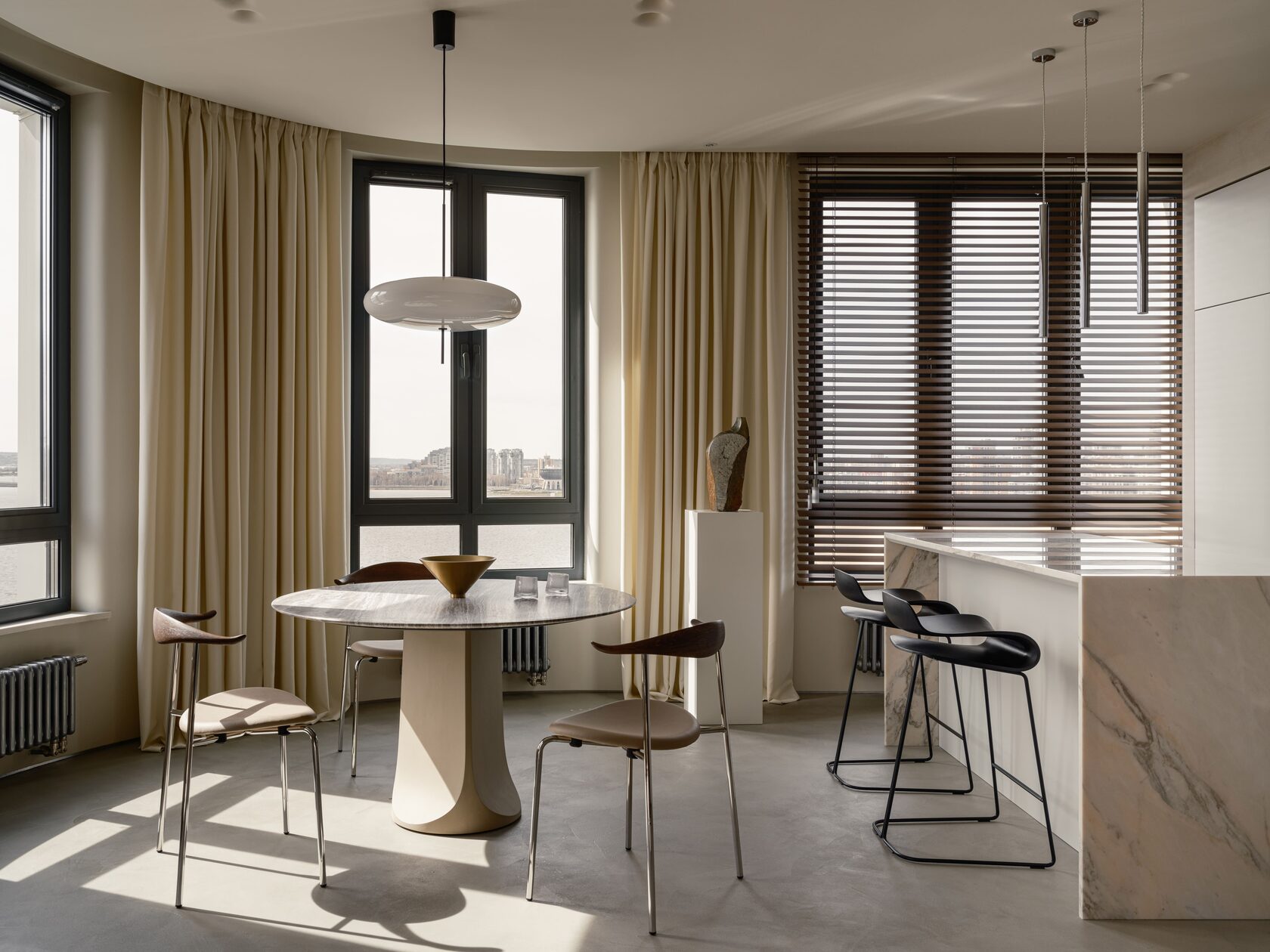 этой квартиры, лично отбирает все бренды, с которыми работает. Объекты попадают к ней в коллекцию только по любви, поэтому неудивительно, что ей захотелось окружить себя ими не только на работе, но и дома. «Мой главный запрос заключался в том, чтобы сделать квартиру максимально легкой и воздушной, — вспоминает Анастасия. — Также было важно создать зону, где могла бы собираться семья — мы довольно дружны, много времени проводим вместе. Поэтому хотелось не возводить стены, а, наоборот, оставить большое пространство с кухней, гостиной и столовой». В квартире смешиваются мебель разных эпох, натуральные фактуры и даже архитектурные решения: несмотря на то, что квартира современная, на потолке над обеденным столом можно заметить лепнину — отсылку к тому, что за окном Петербург. При этом дополнена она именно современной люстрой — от Normann Copenhagen. «Для меня такое смешение — это и есть жизнь», — признается Анастасия.