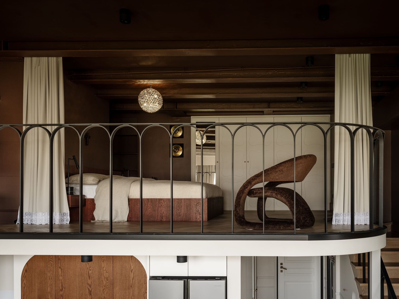 Перила выполнены по эскизам авторов. Бра из металла — винтаж, 13pm.storr.