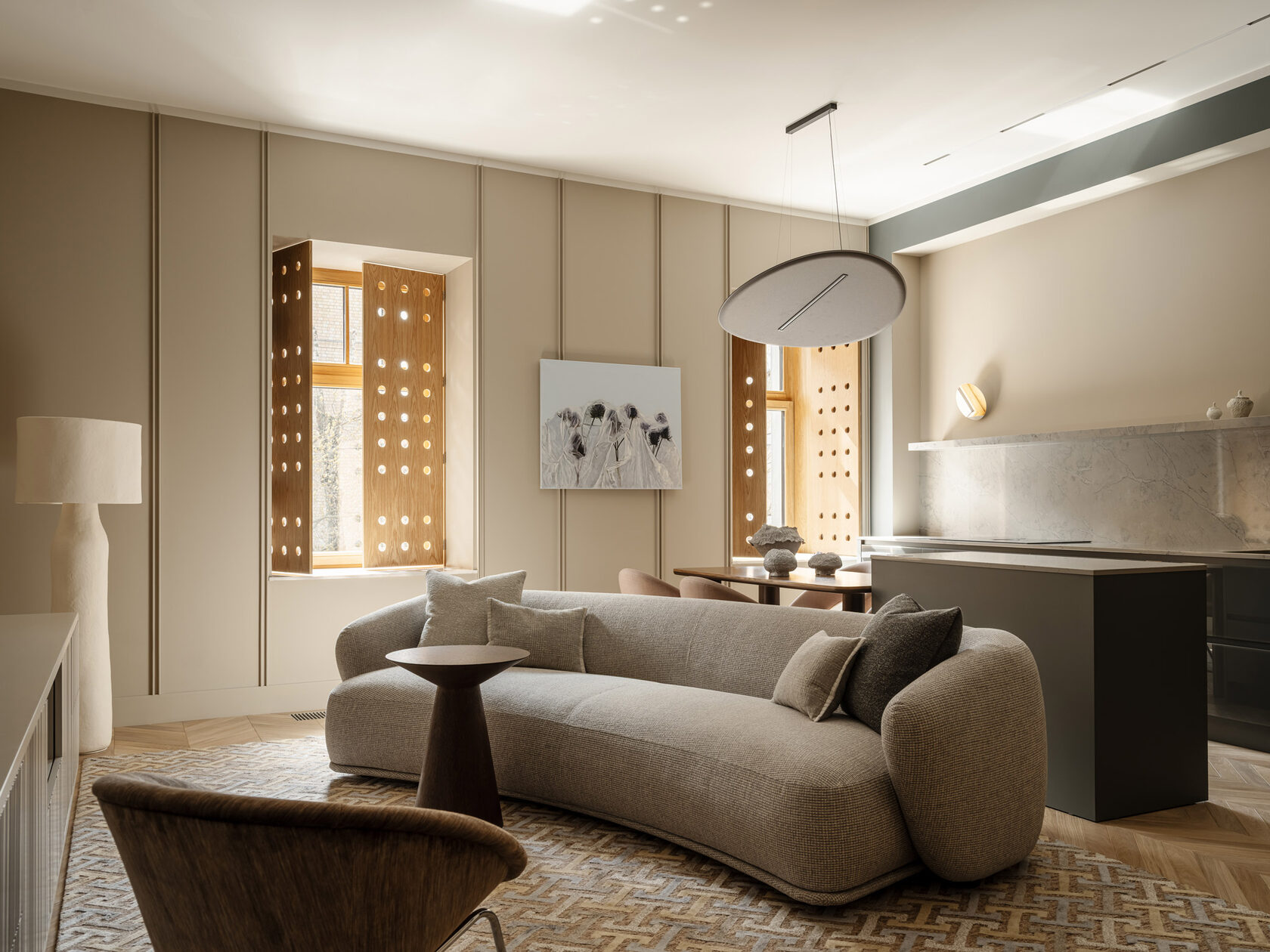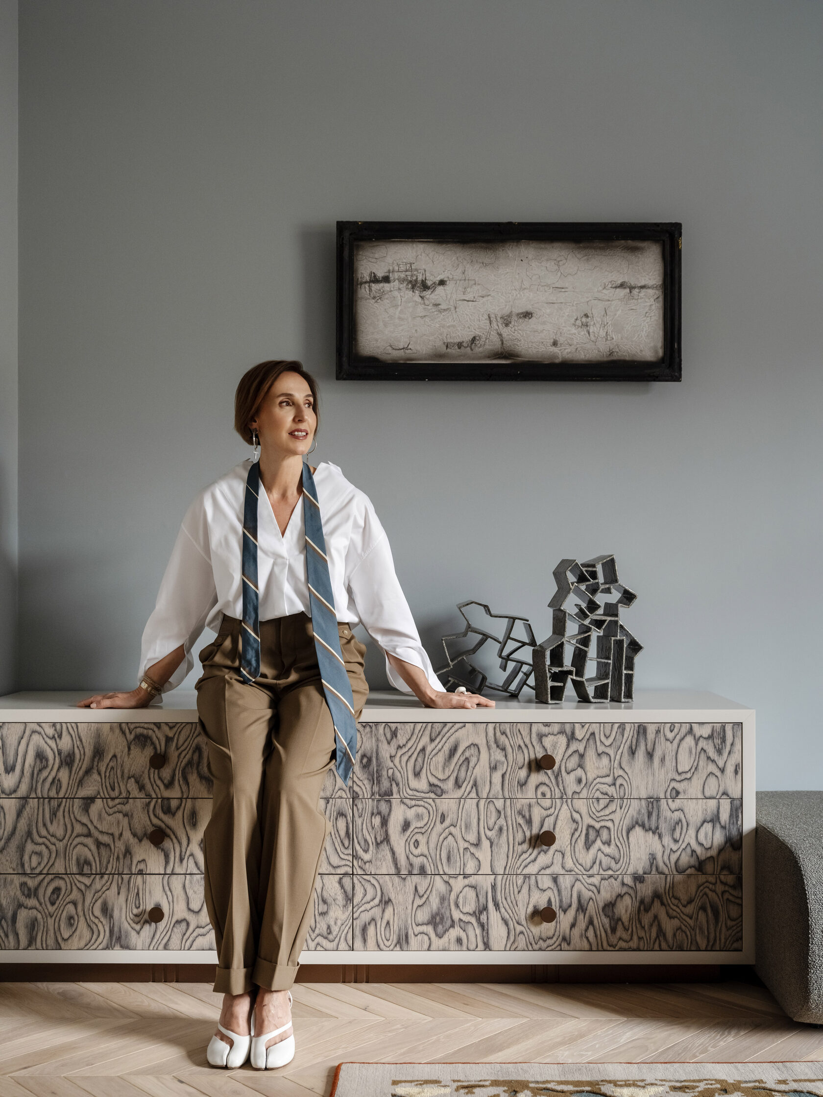 Кабинет. Комод по дизайну Екатерины Бегичевой. На нем —скульптурная работа Людмилы Крутиковой. На стене — художественный лайтбокс Александры Гарт. Здесь же — табурет, придуманный в 1957 году братьями Акилле и Пьером Джакомо Кастильони, Zanotta. Он представляет собой тракторное сиденье на ножке от арбалета, с велосипедным крепежным штырем и корабельной буковой перемычкой.