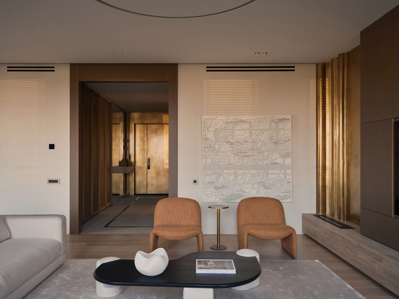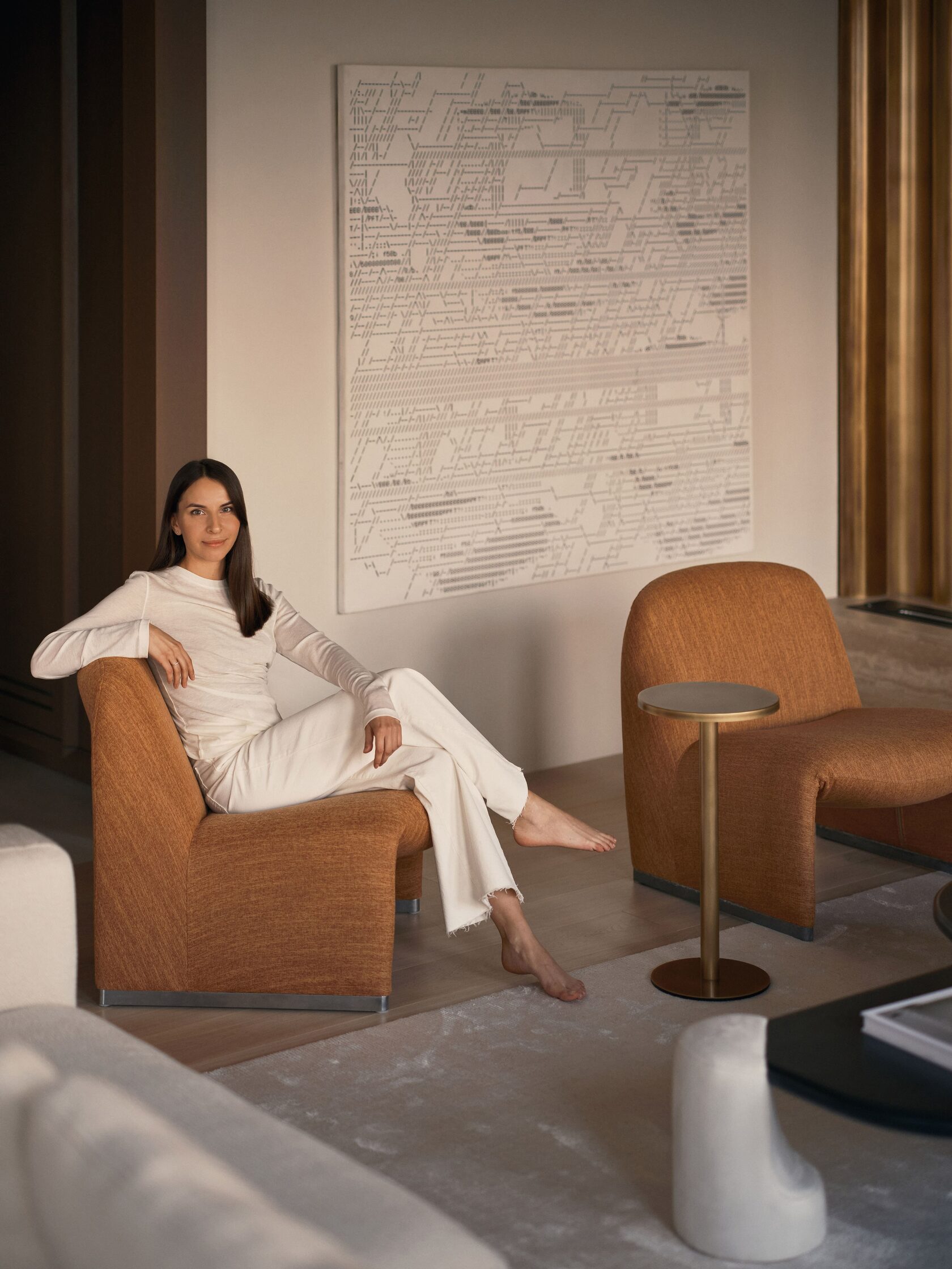 Вид из спальни на мастер-ванную. Деревянная панель за изголовьем выполнена по индивидуальному заказу. Кровать, MONONOVA; прикроватная тумба, 101 Copenhagen. В ванной стены из натурального травертина; фоновая плитка, Laminam. Раздвижная перегородка, «Академия дверей».