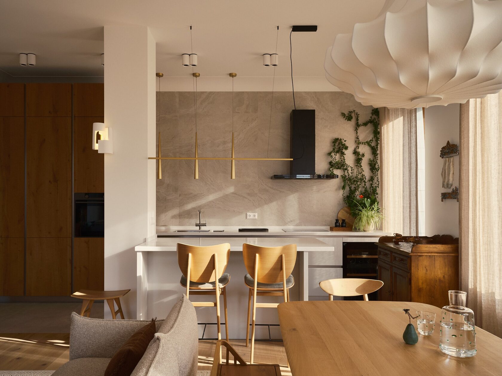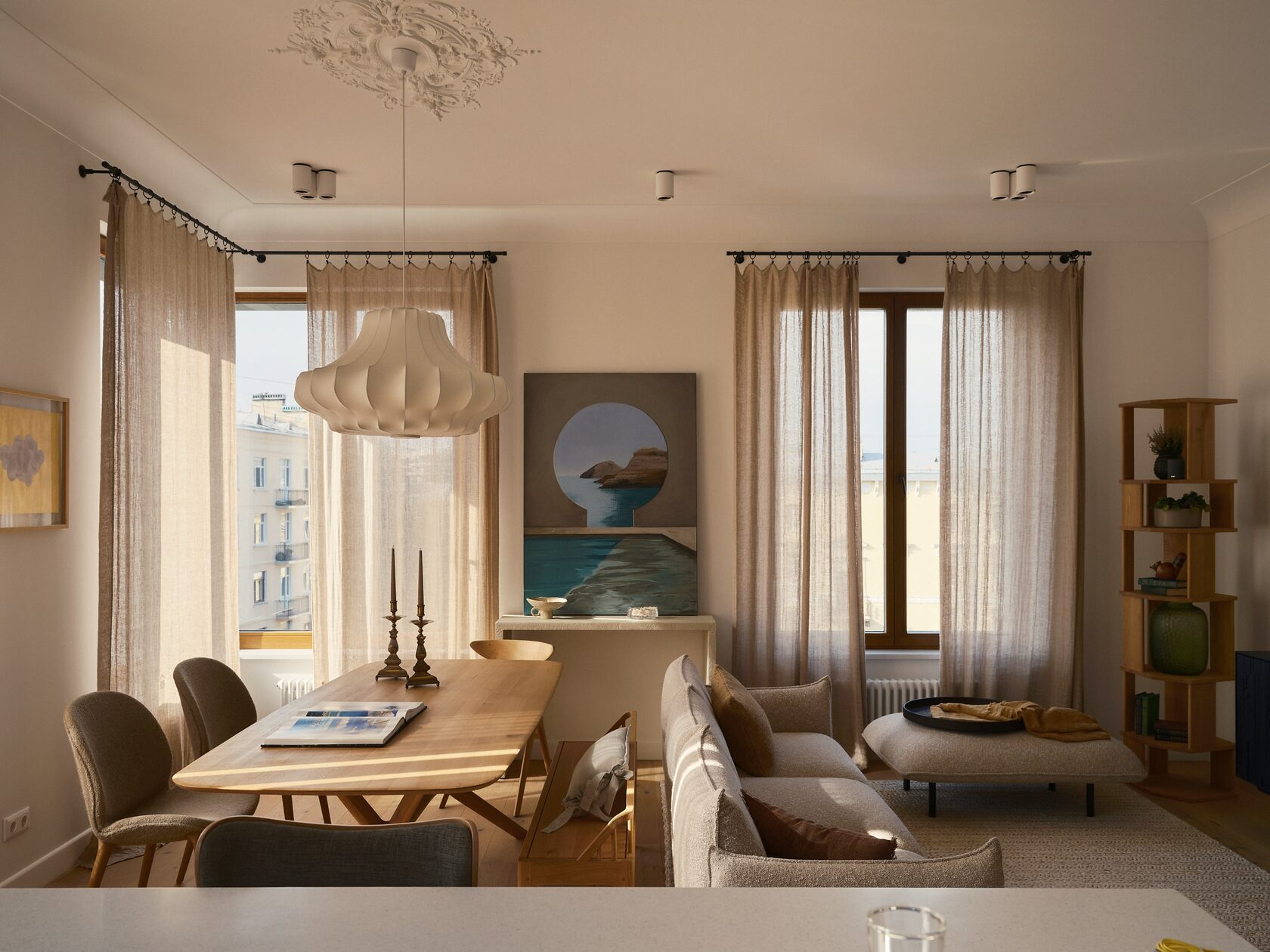 Фрагмент гостиной. Диван, Normann Copenhagen; маленький столик, VIPP; консоль, Ethnicraft; над ней — работа Татьяны Абрамовой. Стол и деревянные стулья, Ethnicraft; мягкие стулья, VIPP; светильник, Normann Copenhagen; подсвечники, винтаж; шторы льняные, LISSOY; работа на стене от Solene Eloy.