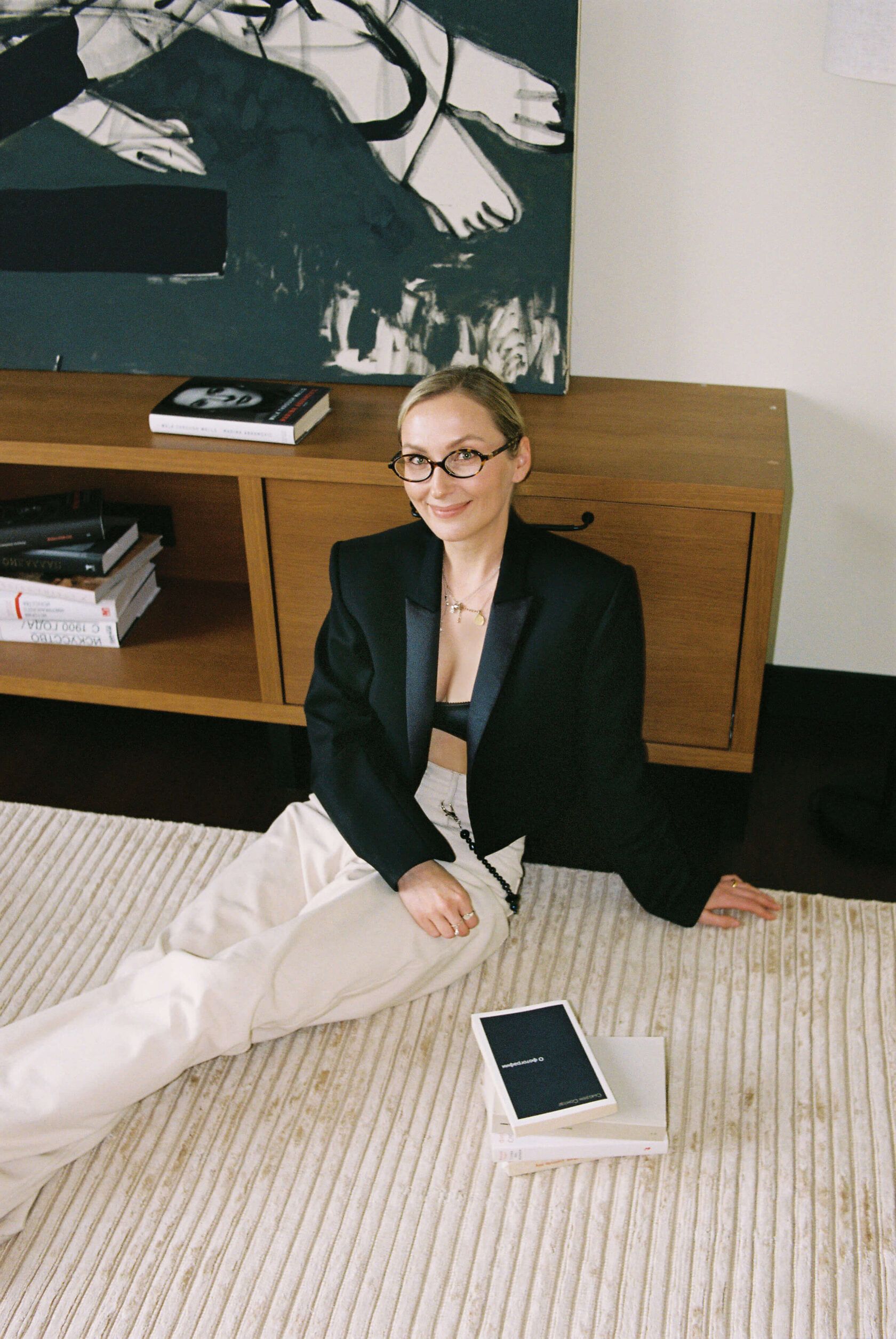 Гостиная. Диван, CASSINA; кресло и ковер, AUDO; торшеры, NEW WORKS; кофейный столик, NORR11; бра, &TRADITION; ТВ-тумба изготовлена на заказ по эскизу KOS Studio. Живопись Алены Гиль.