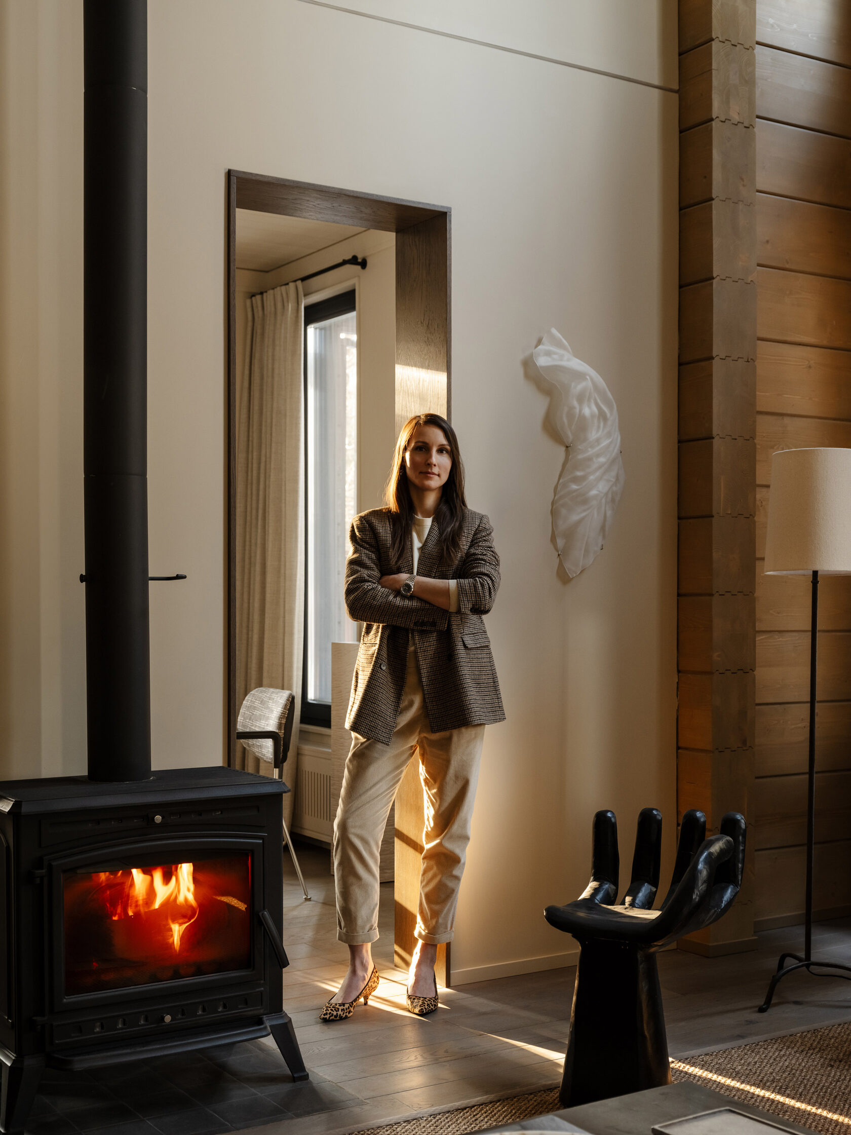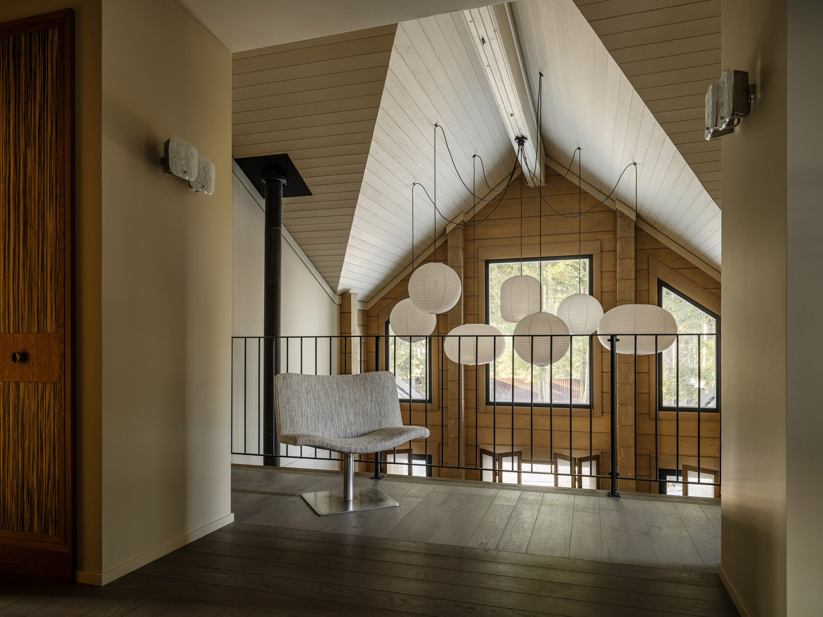 Брус, выбранный в качестве основного материала для стен, задал линии, созвучные с вертикалями елей на участке. Они нашли свое отражение в различных предметах отделки и мебели: в изголовье кровати, фасадах шкафов и дверных полотнах. «Двустворчатые распашные двери сделаны с использованием рифленого стекла и шпонированных вертикальных вставок, — подсказывает Ольга. — Барные двери в кладовке — с вертикальными прорезями, из которых по утрам в кухню льется необыкновенный свет». Отсылки к полоскам и вертикалям считываются и в произведениях искусства. Так в холле второго этажа появилось панно из папье-маше Ульяны Хохловой, автора галереи 3L. Интерьер складывался вокруг вещей: многое было найдено еще в самом начале стройки. Предметы Ольга покупала по внутреннему отклику: «Интерьер собирался в течение довольно длительного времени, несмотря на то, что у меня изначально были наброски-коллажи по каждому помещению. Но в процессе находились новые интересные предметы, я их интегрировала, что-то меняя и отходя от первоначальных зарисовок. С моей точки зрения, такая работа над проектом — самая интересная и результативная».