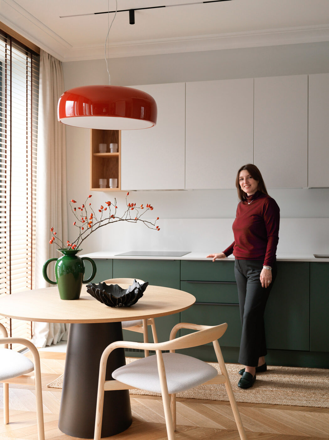 Контрастирует со шкафом кухня в спокойном зеленоватом оттенке. «Заказчица работает в основном из дома, поэтому важно было продумать точки и для отдыха, и для решения задач за ноутбуком», — подчеркивает Анна. Так появился удобный стол, за которым можно не только есть, но и заниматься делами. «Эргономика также имела большое значение, — продолжает архитектор. — Так как заказчица любит готовить, было важно спроектировать кухню с достаточной поверхностью для готовки». Фасады специально продуманы таким образом, чтобы сохранить пространство для трапезы Челси в живописном уголке у окна.