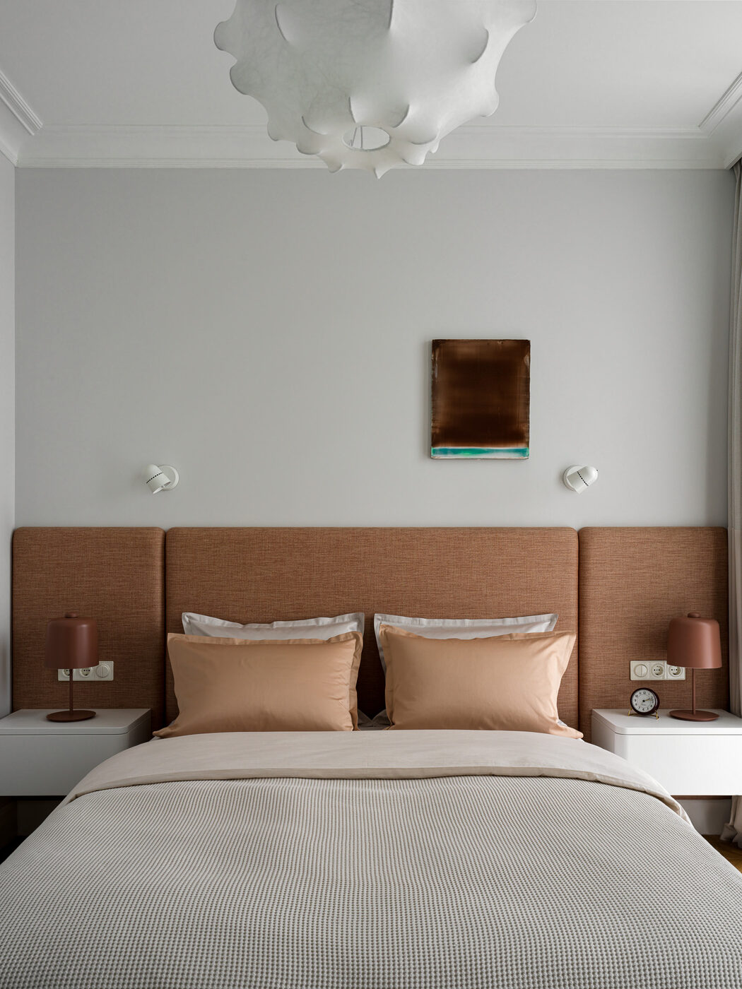Спальня. Кровать, Woodfans; люстра, Flos; настольные светильники и бра, Luceplan; постельное белье и покрывало, Atelier Tati. Картина Никиты Орлова, ART&BRUT gallery.