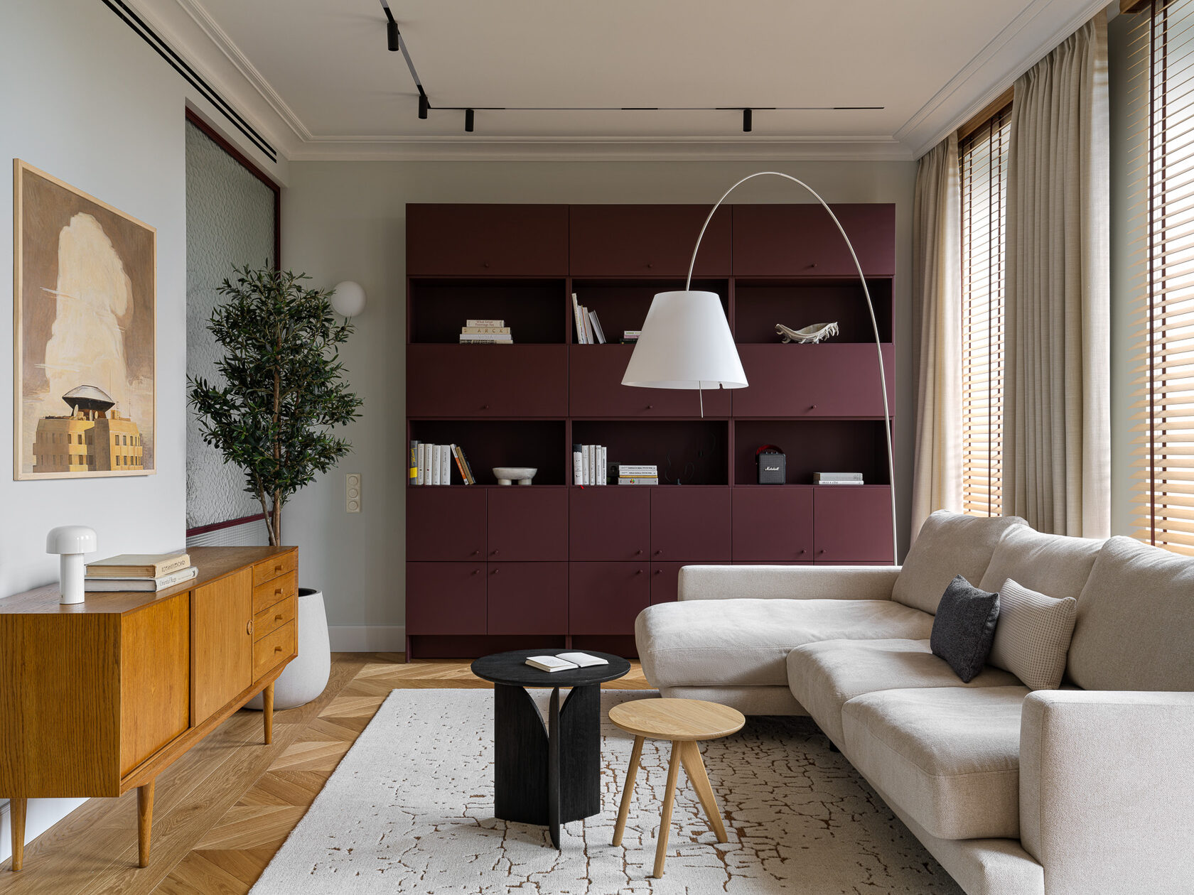 Гостиная. Диван, Ivasa; бордовый стеллаж выполнен по эскизам Анны Скорик компанией R-interior; бра рядом со стеллажом, Fabbian Mochi; торшер, Luceplan; столики, Ethnicraft и NORR11; декоративные подушки, Atelier Tati; ковер, KulturaKovrov.