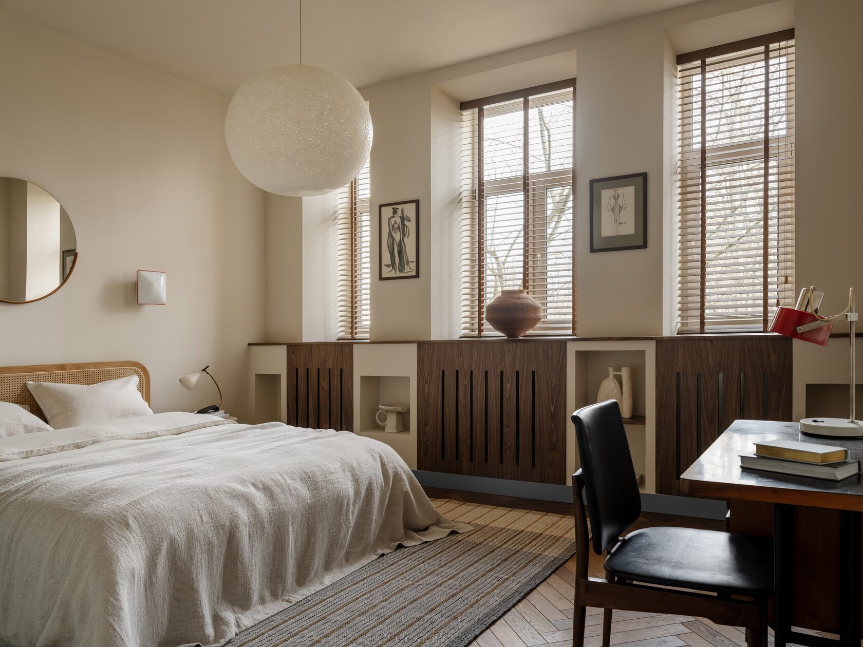 Спальня. Кровать, La Redoute; светильник, Normann Copenhagen; настольная лампа времен СССР найдена на "Авито". Прикроватная лампа от Gerbruder Cosack (Германия 1950-х) и бра от Leucos (Италия 1970-х) — все из Galley Béke. Жалюзи, Volokno Design; ковер, GAN.