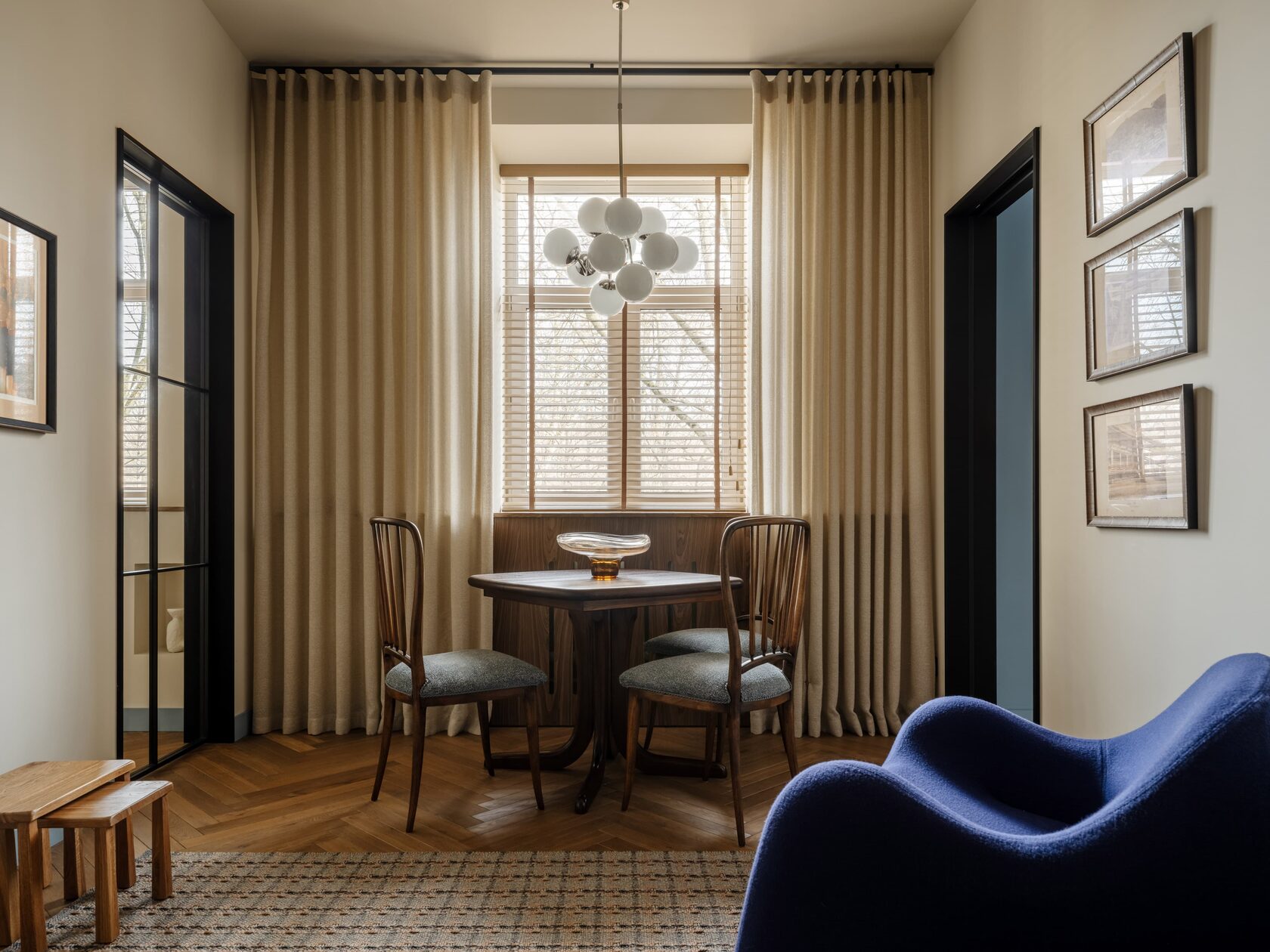 Гостиная. Кресло, Zanotta; приставные столы, «Красиво как раньше». Винтажные стулья (Италия 1950-х), стол (Дания 1960-х), люстра Sputnik от Kaiser Leuchten (Германия 1960-х) — все из Gallery Béke. Жалюзи и шторы, Volokno Design; ковер по дизайну Патриции Уоркиолы, GAN.