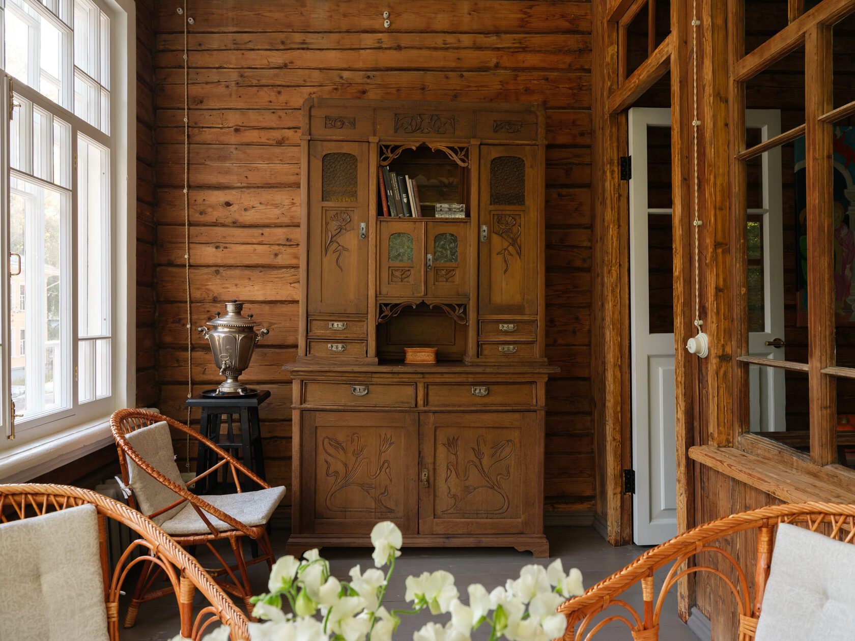 Деревянный, с белыми «ажурными» крылечками и русскими печами, этот особняк в стиле модерн — нетипичный представитель вологодского зодчества. Еще в 2019 году, как вспоминает архитектор Светлана Попова-Знаменская, казалось, что здание обречено: «Помню, я гуляла по улице Кирова, когда увидела его. Дом стоял заброшенный, без крылец, с абсолютно черной резьбой. Я сделала несколько фото на память, потому что выглядел он так, как будто вот-вот „случайно“ сгорит». К счастью, этого не случилось, в том числе благодаря Светлане. «Буквально через полгода после той прогулки я познакомилась с замечательными людьми, Леной и Семеном, — продолжает Светлана. — Они выкупили этот дом и предложили мне с командой VALKEDA помочь с созданием концепции и дизайна проекта гостиницы».
