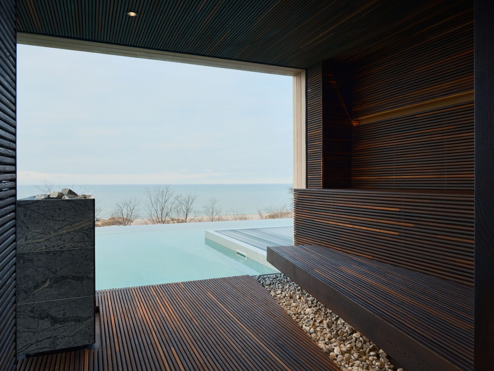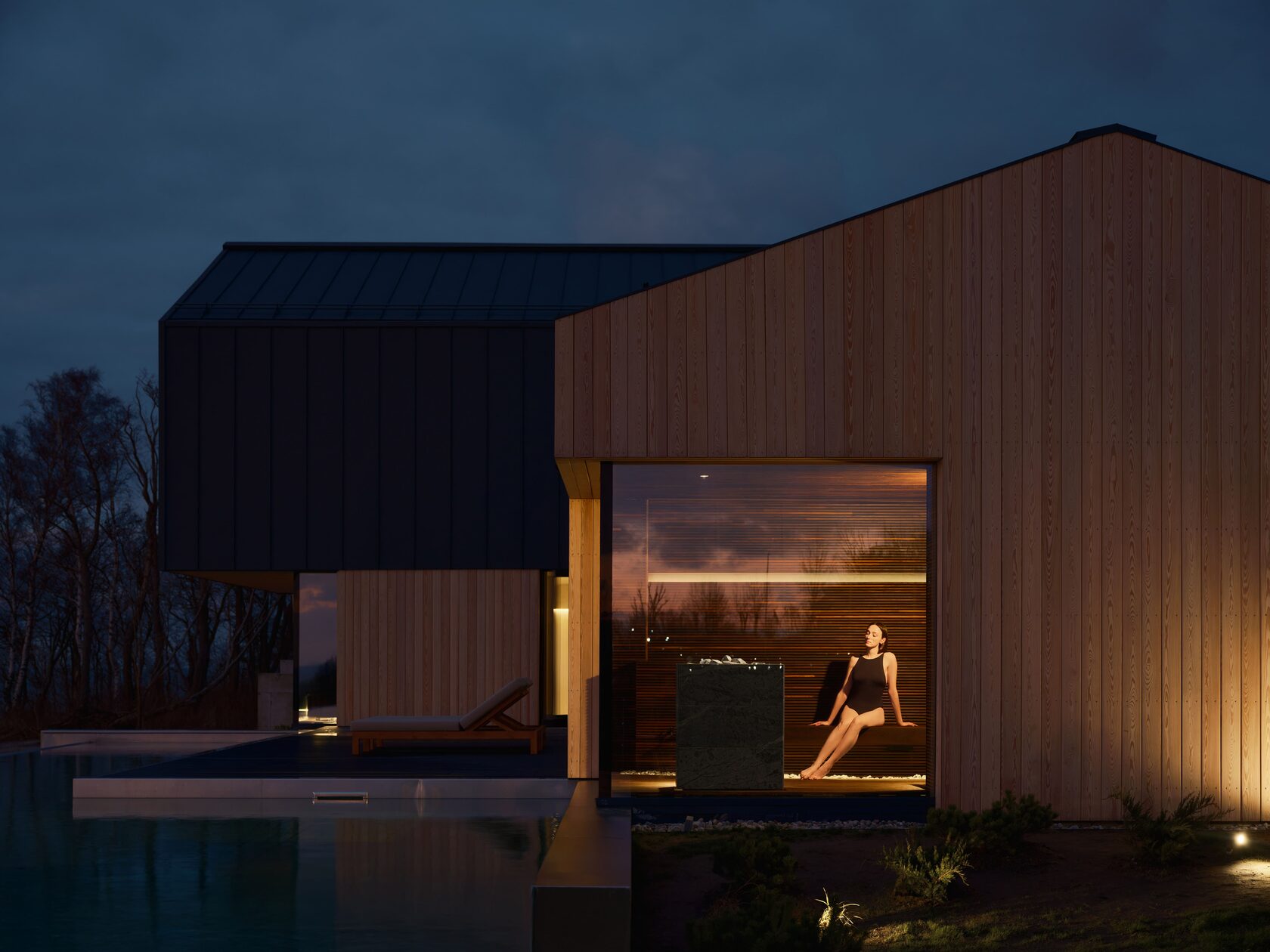 На такую задумку команду вдохновила, конечно же, локация. Объект располагается в поселке Янтарный Калининградской области, на берегу Балтийского моря, поэтому было важно по максимуму открыть виды на воду. «Спа-комплекс полностью ориентирован на панораму побережья, поэтому сердцем проекта стали видовые зоны с окнами от пола до потолка, которые превращают каждый сеанс в диалог с природой. Особенно впечатляющие панорамы открываются из двух парных и инфинити-бассейна, подогреваемого до 33−35 градусов в холодное время года», — продолжают авторы.