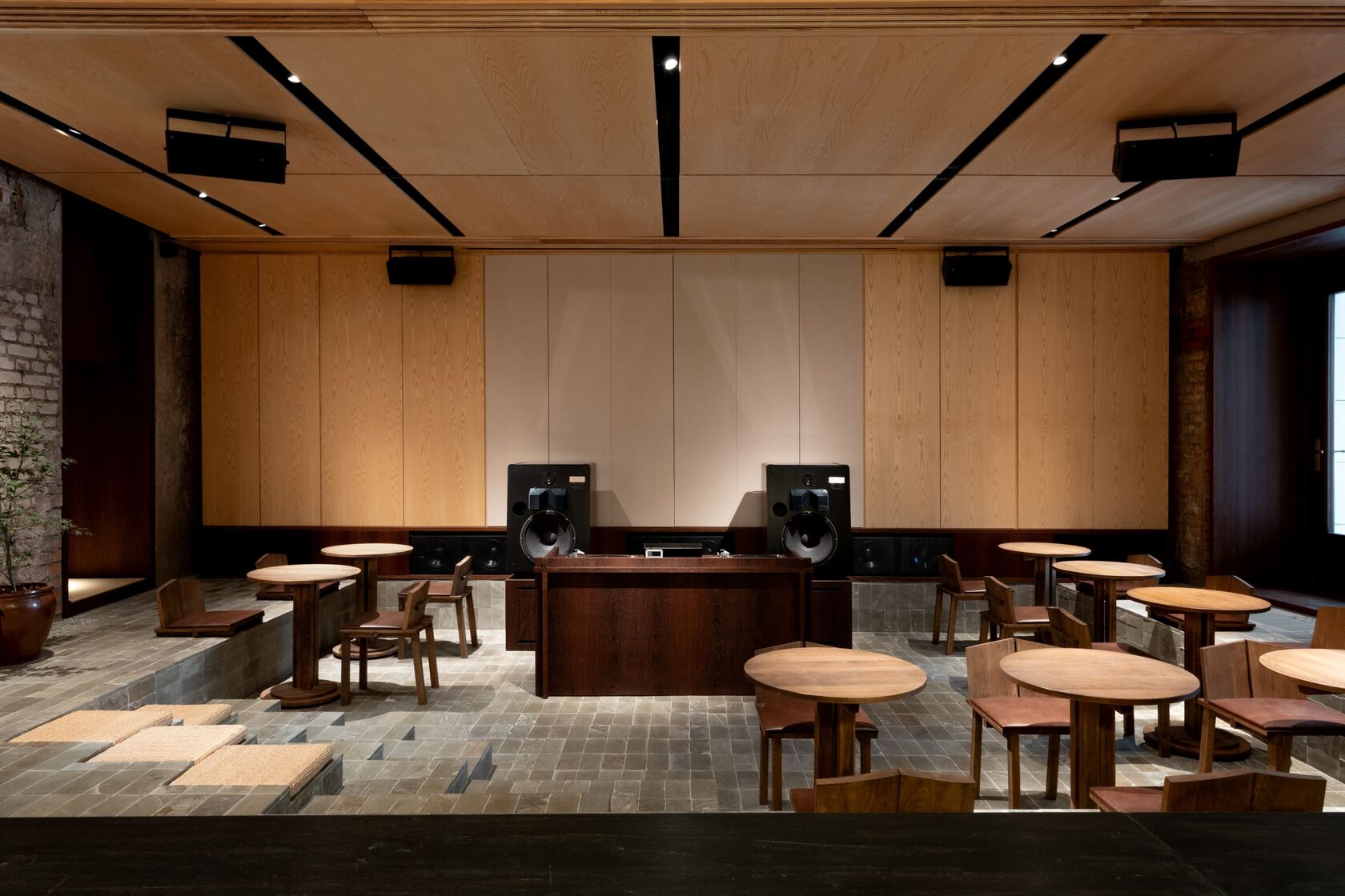 Заведение поделили на несколько частей: основной зал, бар, мини-зону для прослушивания пластинок и веранду. Для отделки задействовали разные породы дерева: бук, дуб, березу, а практически всю мебель и декоративный свет выполнили на заказ. «Разбавляет древесину наша любимая бязь — локальный аналог рисовой бумаги, — добавляют архитекторы. — Также местами мы оставили родную фактуру кирпича, а пол сложили из каменной брусчатки».