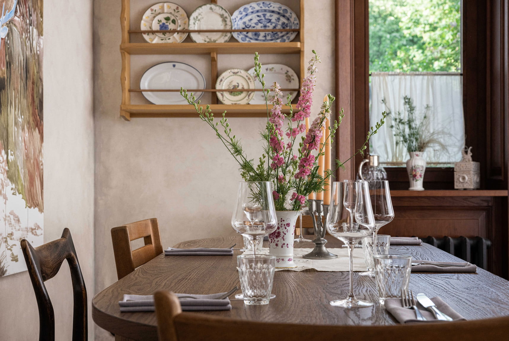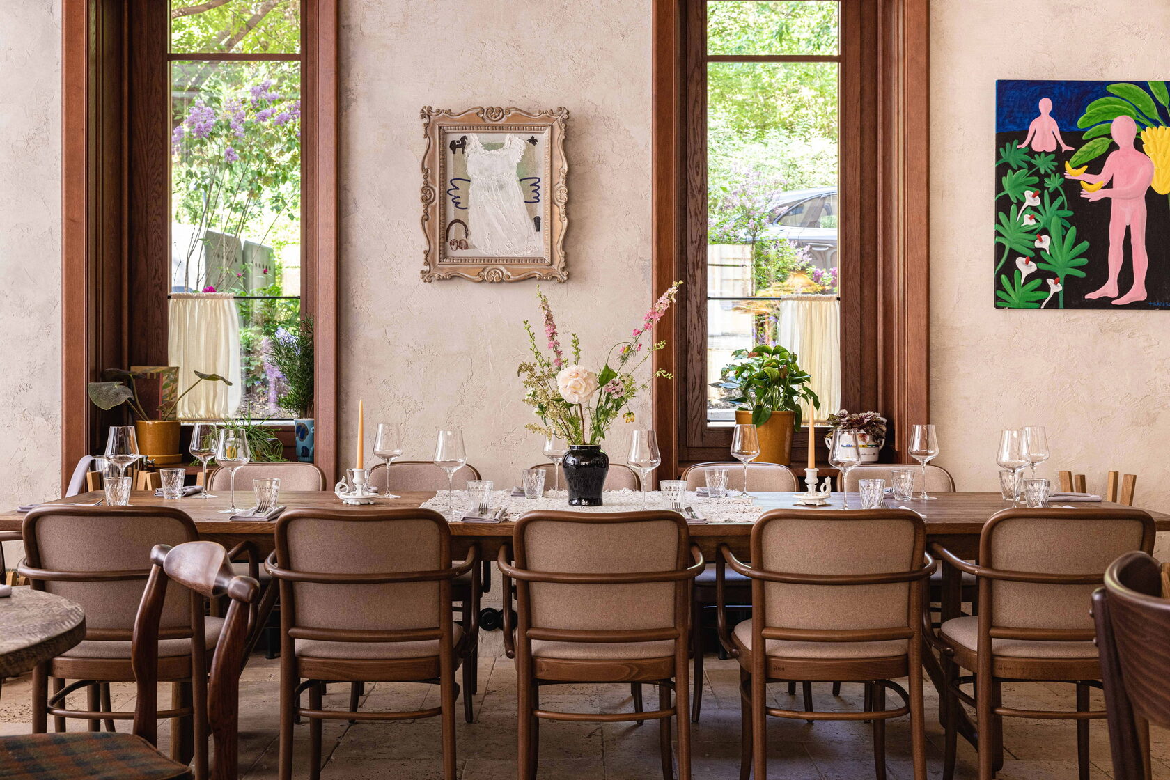 Важную роль в Mamie играют и детали: картины молодых художников, винтажные подсвечники, керамические шкатулки и живые цветы, которые вместе с дизайнерами подобрала директор по эстетике Lucky Group Валерия Сергеева, создали в бистро теплую и уютную атмосферу.