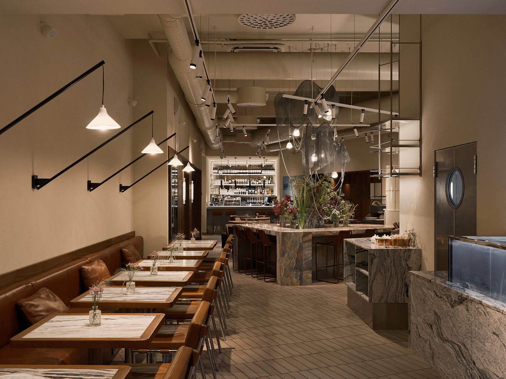 Внимание привлекают детали: настенные светильники, напоминающие удочки, во входной зоне; мраморная стойка с аквариумом и витриной для морских деликатесов рядом с открытой кухней; ниши со шпоном ореха в местах высокой посадки и, конечно, обеденный стол со светильником-арт-объектом в центральной части зала.