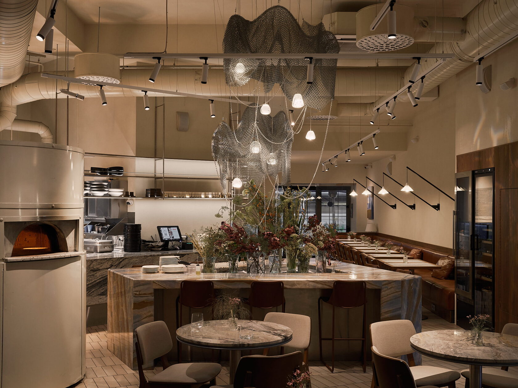 «Он выполнен из металлических цепей с интегрированными в них светильниками, — обращают внимание в Static Aesthetic Architects. — Все это — отсылка к рыболовным сетям, лежащим на дне моря». Деревянные панели на стенах в санузлах, раковины из нержавеющей стали и мраморная столешница создают ощущение корабельного трюма. А кастомная дровяная печь с воздуховодами и эмалированными листами металла и заклепками, хотя и вызывает ассоциации с корабельными трубами, все же напоминает — мы находимся в ресторане высокой кухни.