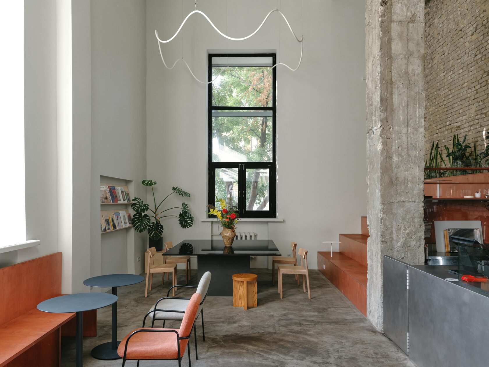 Создать интерьер книжного магазина в здании 1953-го года по проекту архитектора Л. В. Руднева предстояло команде бюро СХЕМА. Они сделали ставку на функциональность и лаконичность, максимально сохранив исторические элементы и наполнив пространства с шестиметровыми потолками натуральными цветами и фактурами. Архитекторы очистили мраморный тераццо и стену амфитеатра в кафе, отреставрировали лестницу и шкафы, которые дополнили современными предметами.