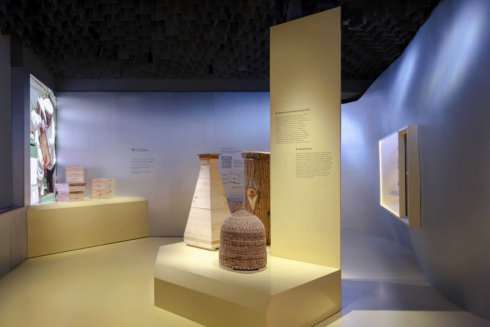 В павильоне «Пчеловодство» нам было важно переосмыслить музейное пространство через современный визуальный язык и при этом сохранить логику экспозиции. Мы выстраивали цельный маршрут выставки в тесном диалоге с музейными кураторами и архивами.