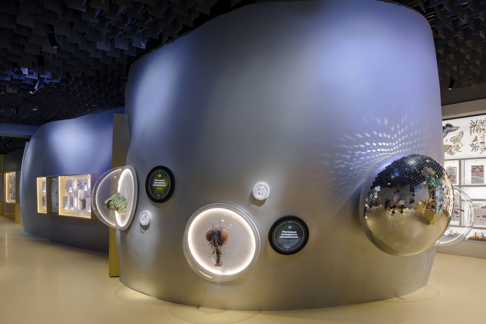 Нам хотелось создать ощущение погружения в мир насекомых — это проявилось во всех дизайн-решениях. Пространство получилось современным, но при этом сохранило научную значимость. Маршрут посетителя задает центральная изогнутая стена: она проходит через всю экспозицию, объединяет пространство, задает ритм восприятия и напоминает спинку жука-скарабея.