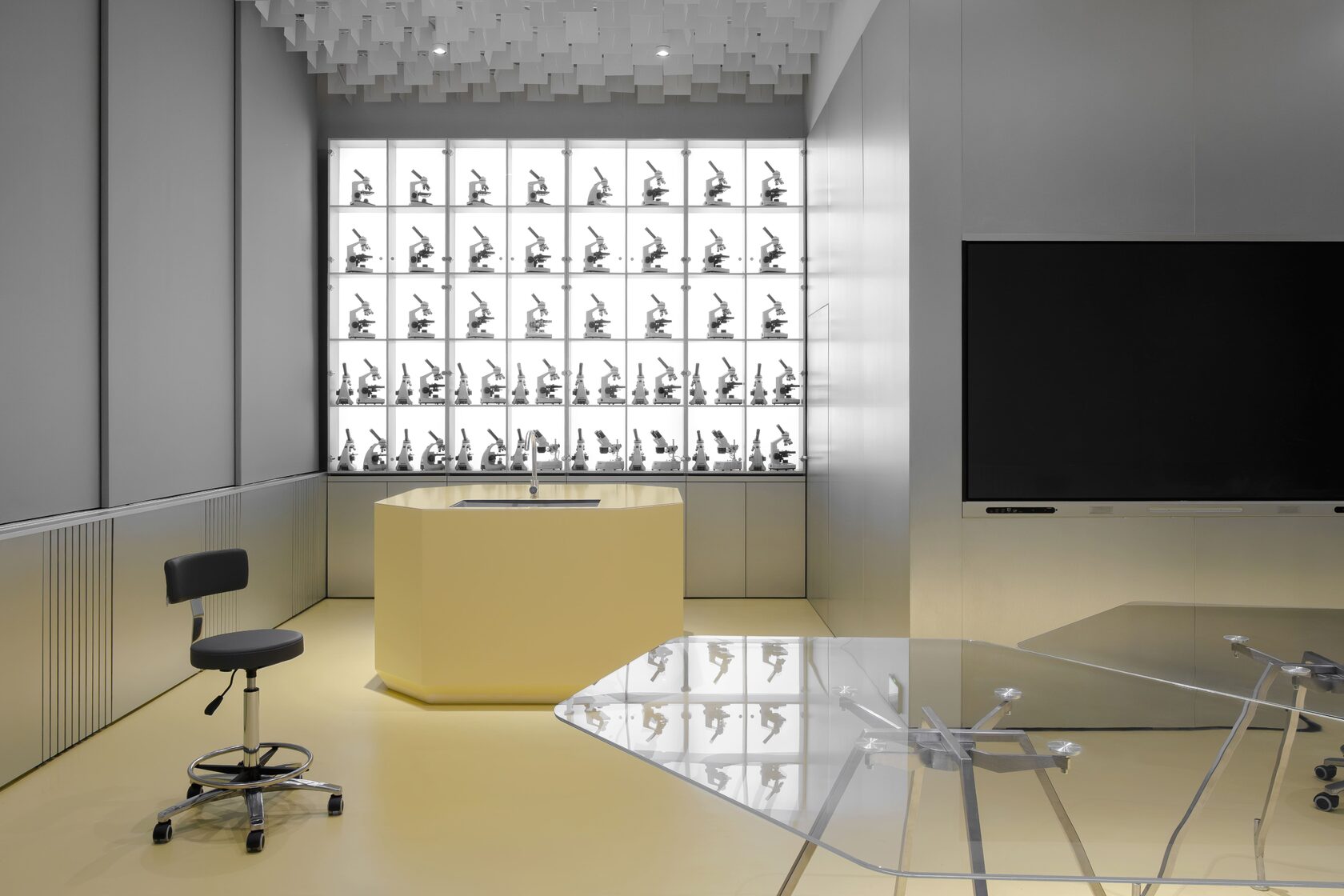Основной формой стал шестигранник — отсылка к пчелиным сотам. Центральным цветом экспозиции выбрали желтый, вдохновившись оттенком пыльцы в работах художника Вольфганга Лайба. Эти решения проходят через весь проект — от планировки до мебели и витрин.
