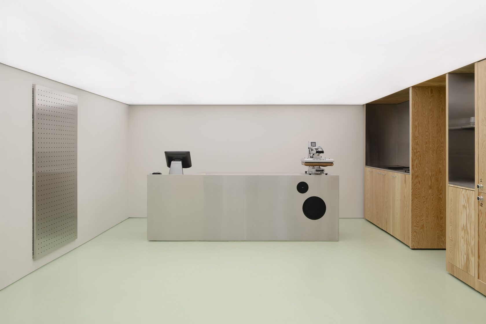Материалы и цветовые решения формируют гармоничную среду. Пол выполнен в фирменном мятном оттенке GRI, текстура хвойной фанеры «мегашкафа» добавляет тепла и уюта, а холодный металл, задействованный в зоне ресепшн и в конструкции стены, работает на контрасте, расставляя локальные акценты.