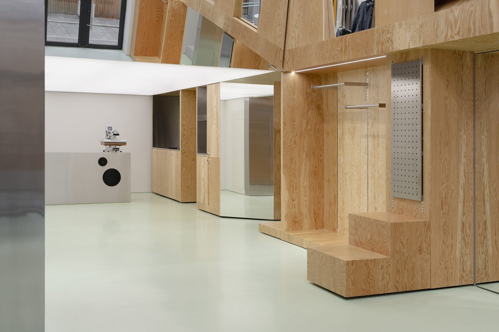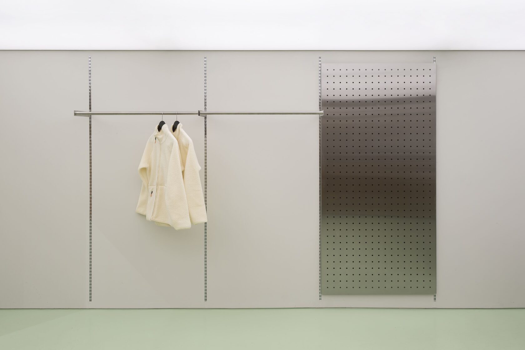 На антресоль архитекторы добавили большое наклонное зеркало, в котором посетители могут делать фотографии, а под ней, на первом этаже, на всю площадь потолка установили лайтбокс, обеспечивающий равномерное и комфортное освещение. Торговое оборудование сделали полностью трансформируемым: рейлы фиксируются на разных уровнях, а возможность фронтальной развески позволяет демонстрировать коллекции и адаптировать пространство под разные сценарии использования.