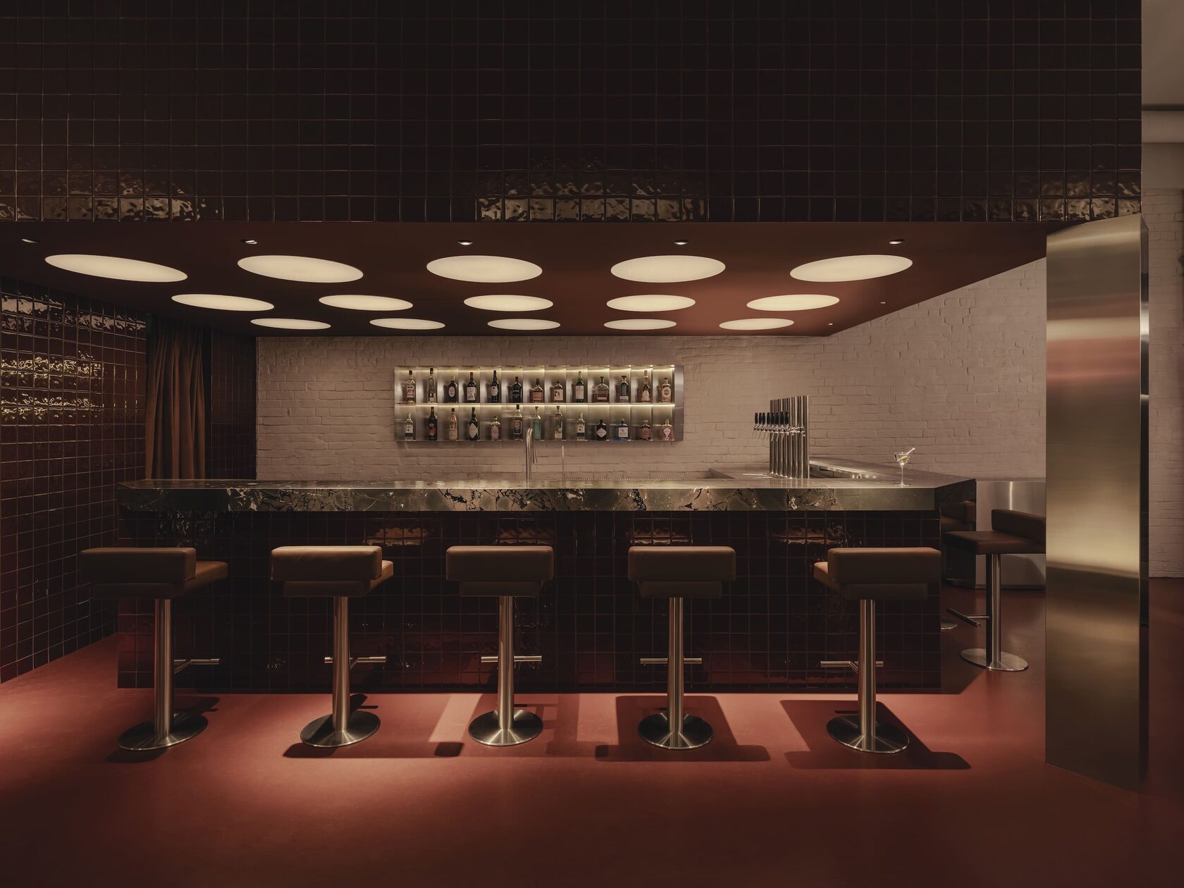 За счет антресоли получилось увеличить количество посадочных мест и расширить общую площадь заведения до 104 м². К слову, на втором уровне атмосфера получилась совсем иная — если первый этаж бара выполнен в духе бистро, то наверху, скорее, лаундж-зона. «Здесь стоят вельветовые диваны и стулья с подлокотниками, а нуарный облик поддерживается акцентным освещением столов», — добавляют архитекторы.