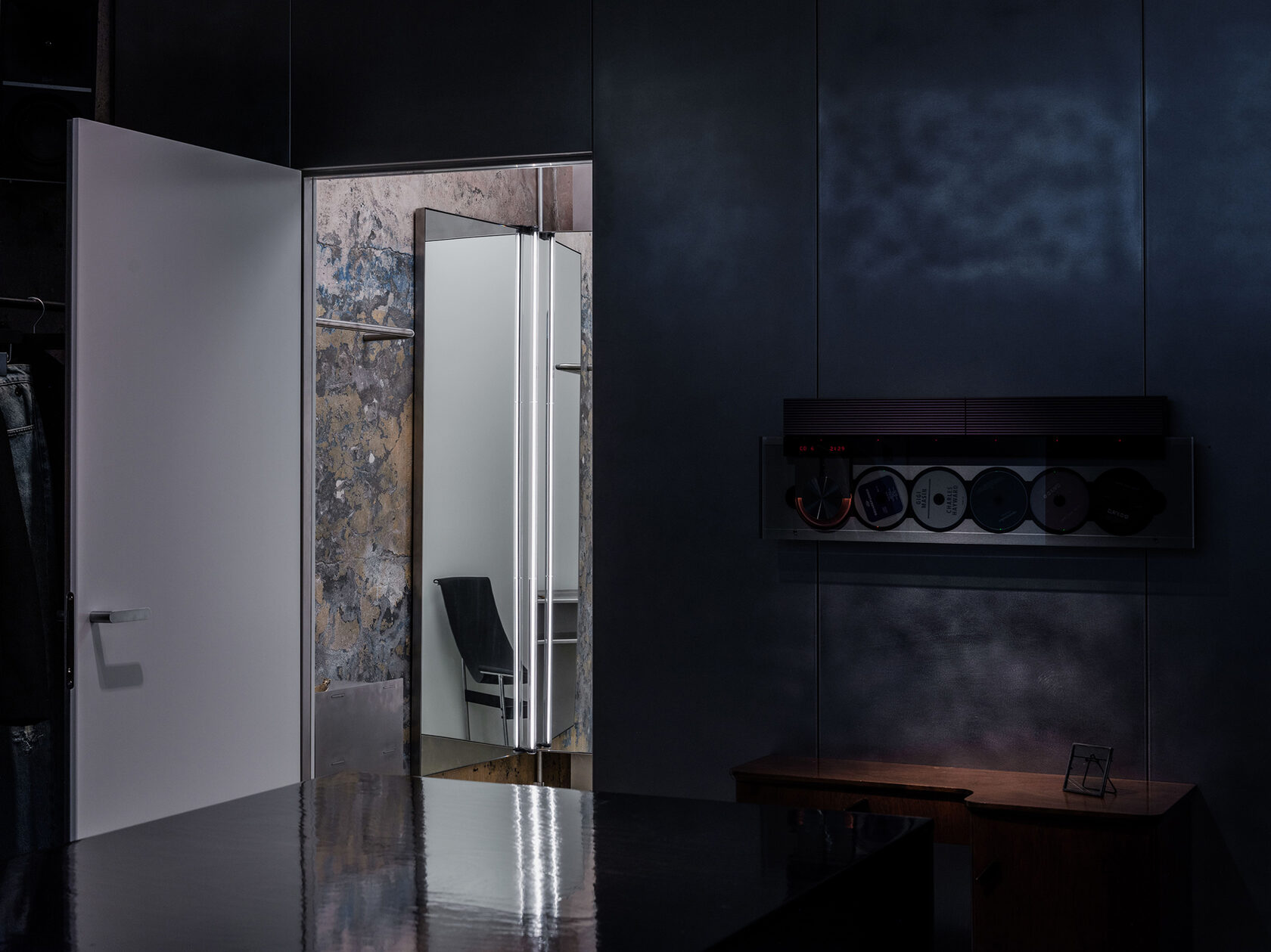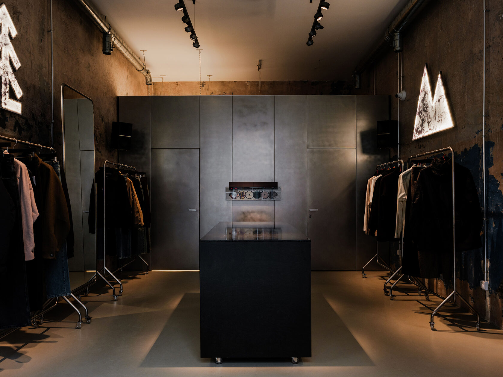 Шоурум задуман как место, где хочется задержаться: прийти не только за покупкой, но и за визуальным и эмоциональным опытом. В интерьере мы стремились объединить все направления, которые формируют бренд — моду, архитектуру, дизайн и музыку. Особое место здесь занимает искусство: шоурум функционирует в том числе и как галерея. Изначально здесь были представлены работы Андрея Бергера, а сейчас висит работа Hotels And A Swimming Pool Стэнли Донвуда с автографом Тома Йорка.