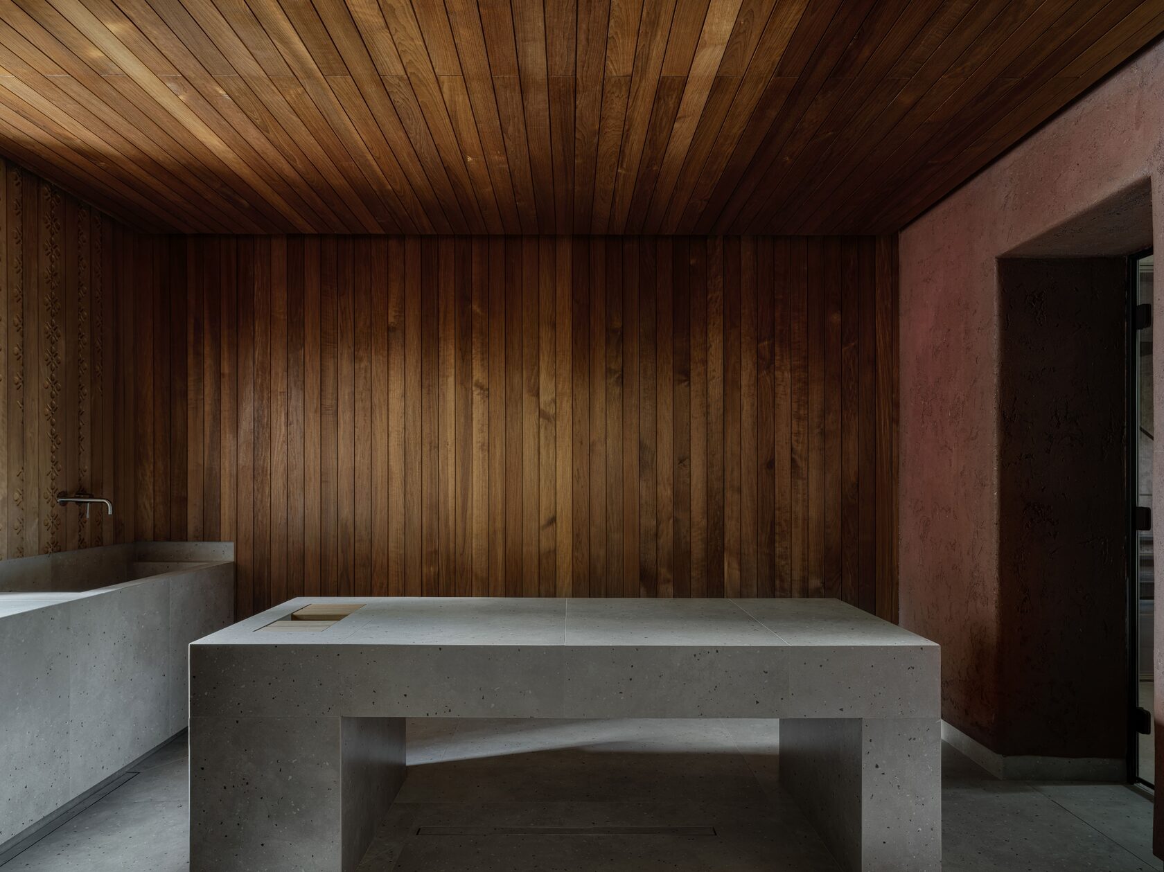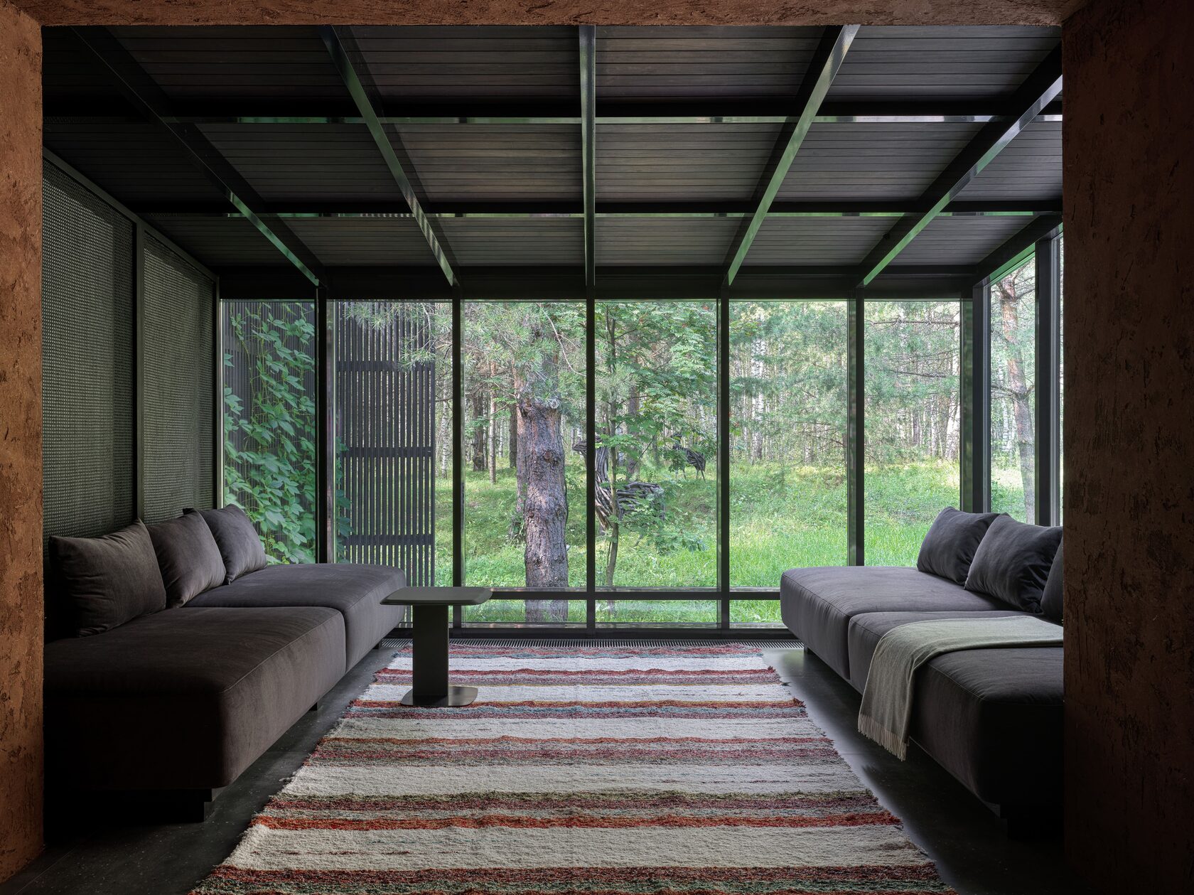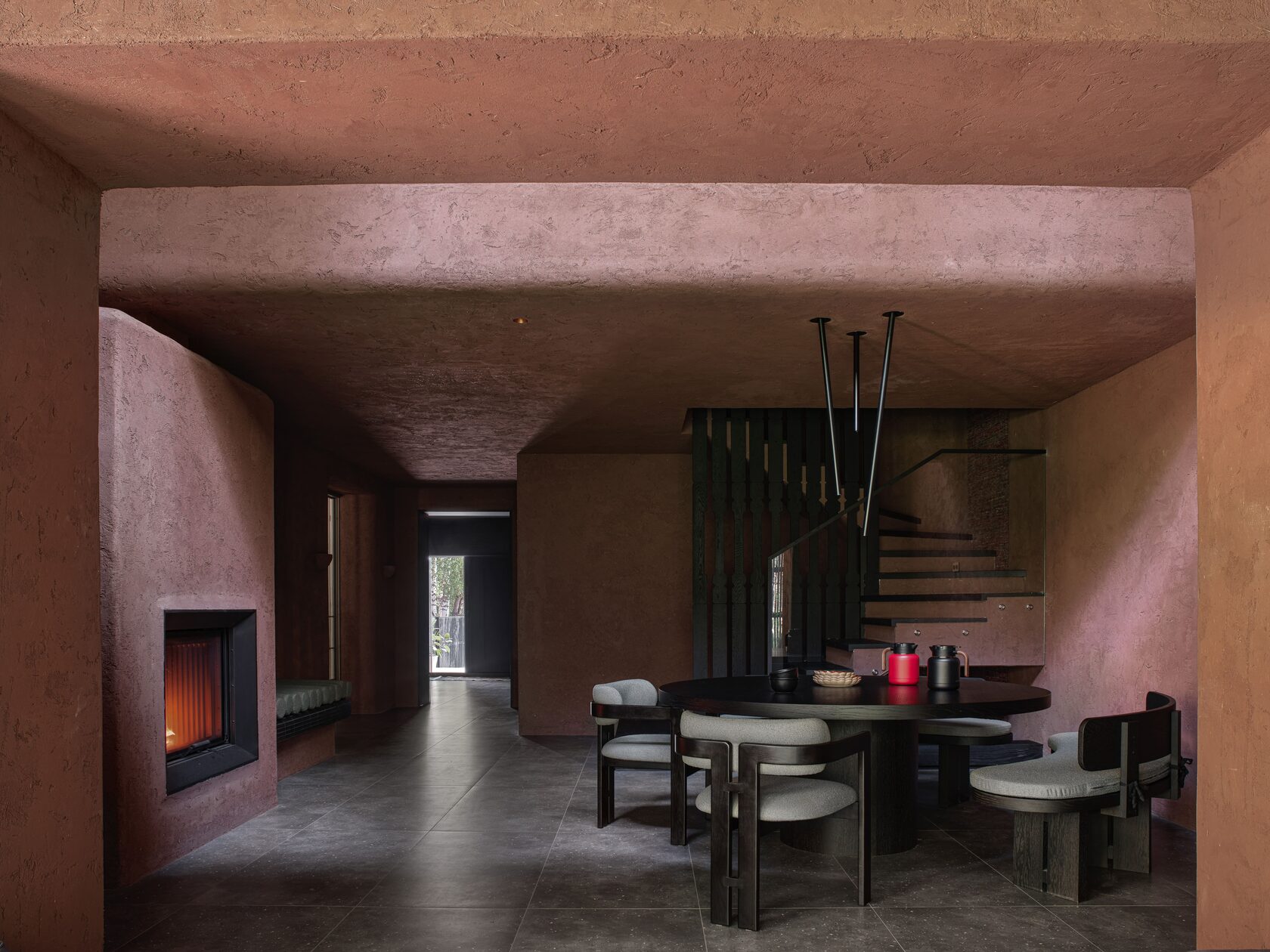 Дерево, лен, травертин и глубокие черные акценты создают ощущение заземления. В отделке стен — натуральная глина. «Мы пошли дальше привычных бежевых тонов, — отмечает дизайнер. — Терракотовые и черные оттенки появились не только на стенах, но и на потолке».