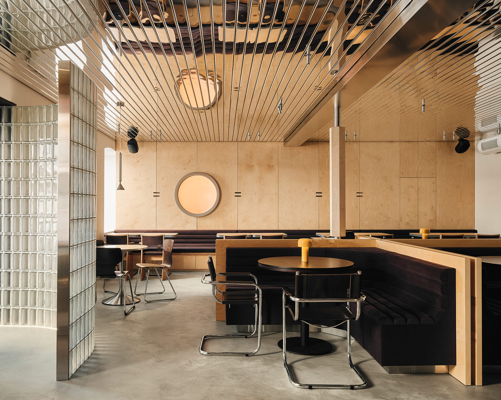Со входа гостей встречает стена из стеклоблоков, выложенная дугой. Рядом — барная стойка и столик хостес, выполненный по аналогии с ретро-колонкой Gale GS401A: вместе они, за счет темного орехового шпона, образуют визуальный переход между двумя залами — малым и основным. Первый из них отдан под открытую кухню и часть посадочных мест. Темные ореховые панели на стенах, потолке и полу формируют ощущение приватности, контрастируя с более светлым и воздушным основным залом. Он же, в свою очередь, отделан фанерой и дополнен зеркальным потолком. Металлические рейки задают футуристичное настроение и вместе с винтажными стульями Elmar Flototto Rosewood Side Chair подчеркивают легкий ретро-оттенок пиццерии.
